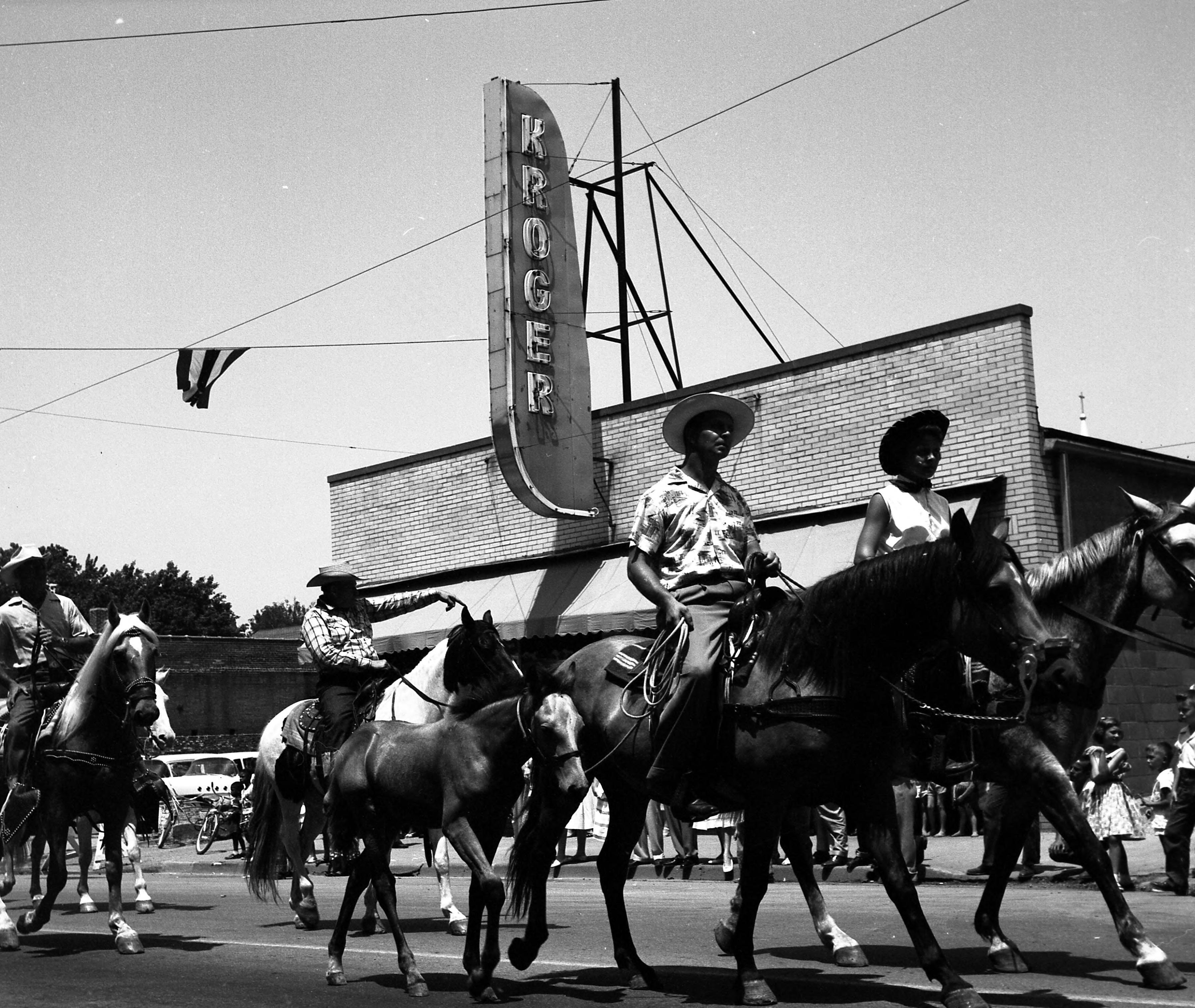 Wabash Memorial Bridge dedication parade. People on horseback on Main St. during a parade, in front of the Kroger store.