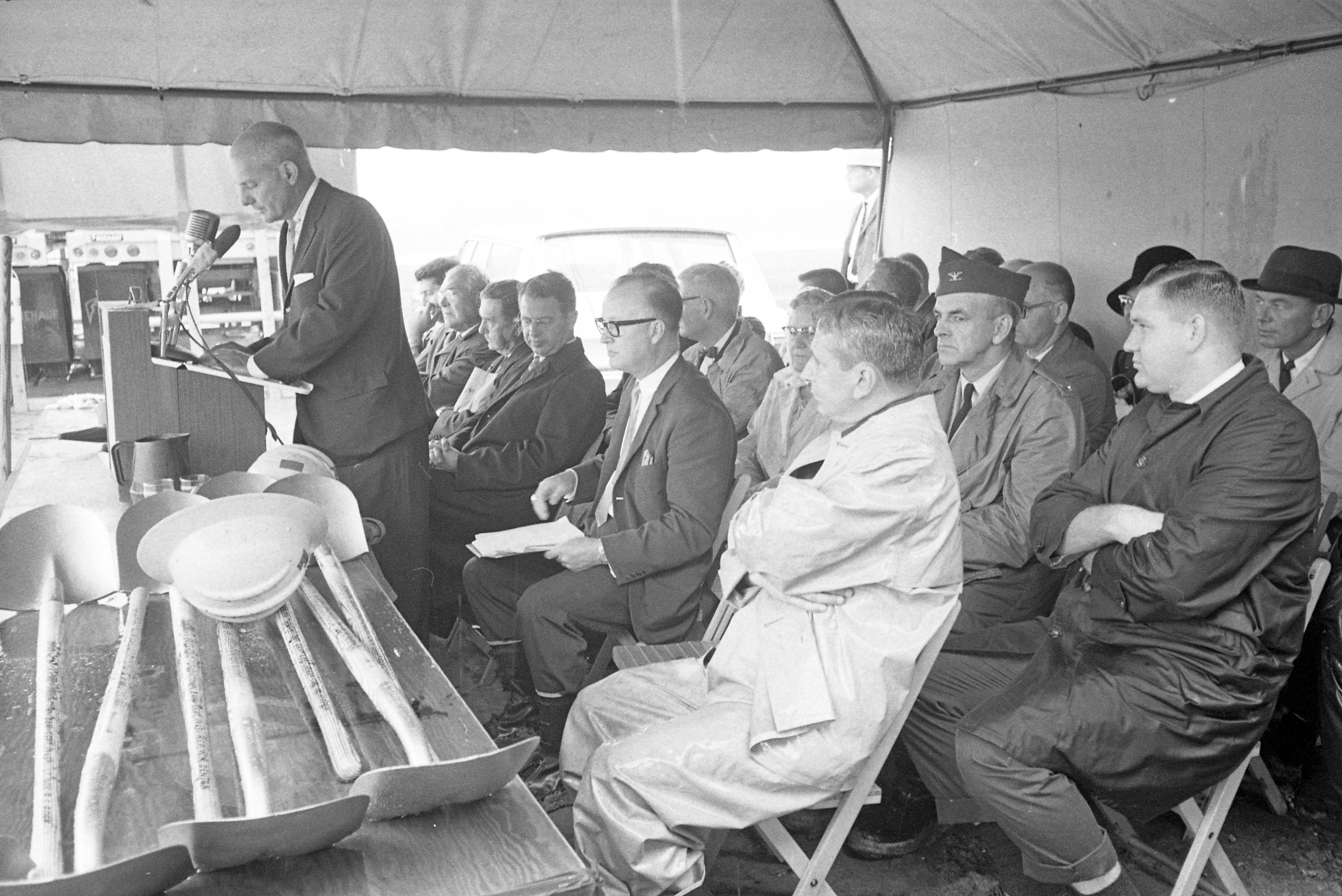 Ground breaking on Uniontown Lock and Dam. This dam replaced the lock and dams numbers 48 and 49. The facility is in Posey County, Indiana and Union County, Kentucky. It was the 17th lock and dam built on the Ohio River. It was renamed the John T. Myers Lock and Dam in 1996. Senator Vance Hartke and former Mayor of Evansville, Indiana is to the left of the man at the podium