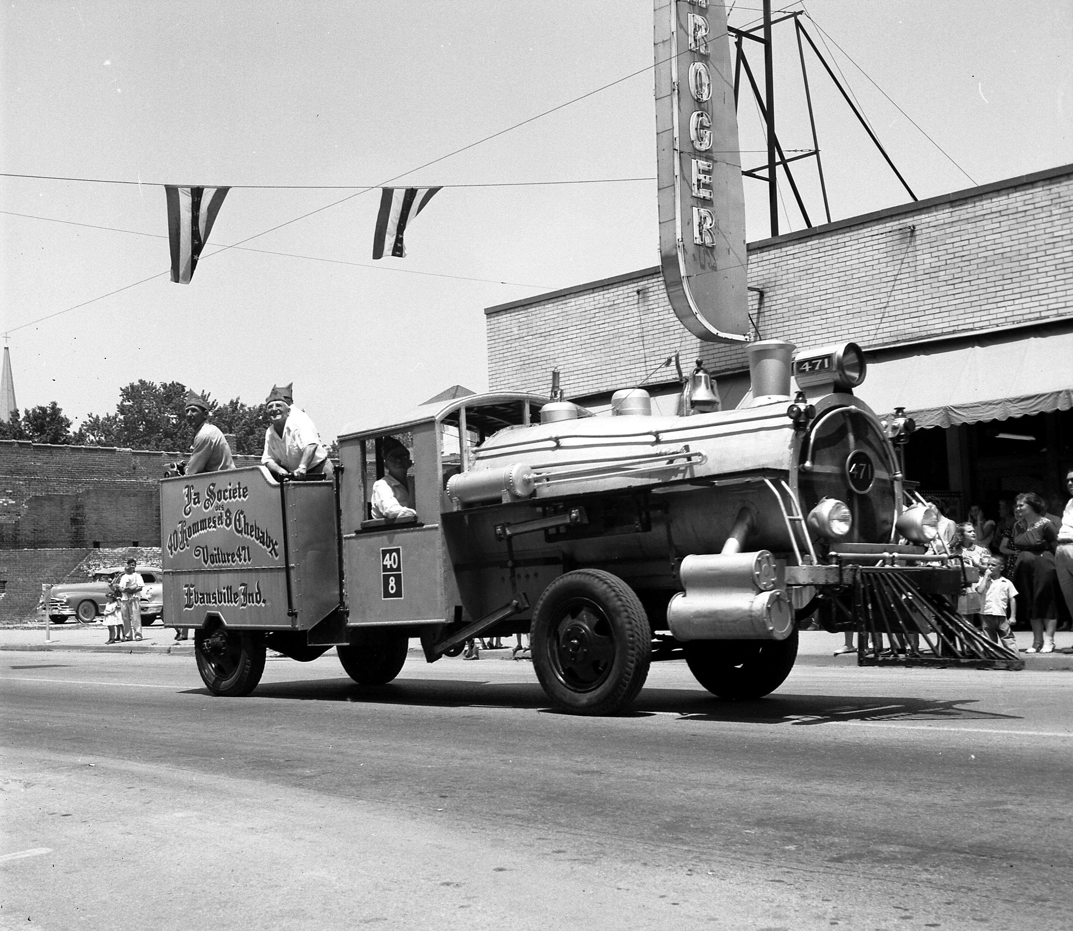 Railroad car labeled La Societe des 40 Hommes et 8 Chevaux Voiture 471 Evansville, Ind. on Main St. during a parade--in front of the Kroger store. La Soci�t� des 40 Hommes et 8 Chevaux is French for The Society of Forty Men and Eight Horses. It is an organization for veterans. Voiture translates as car.