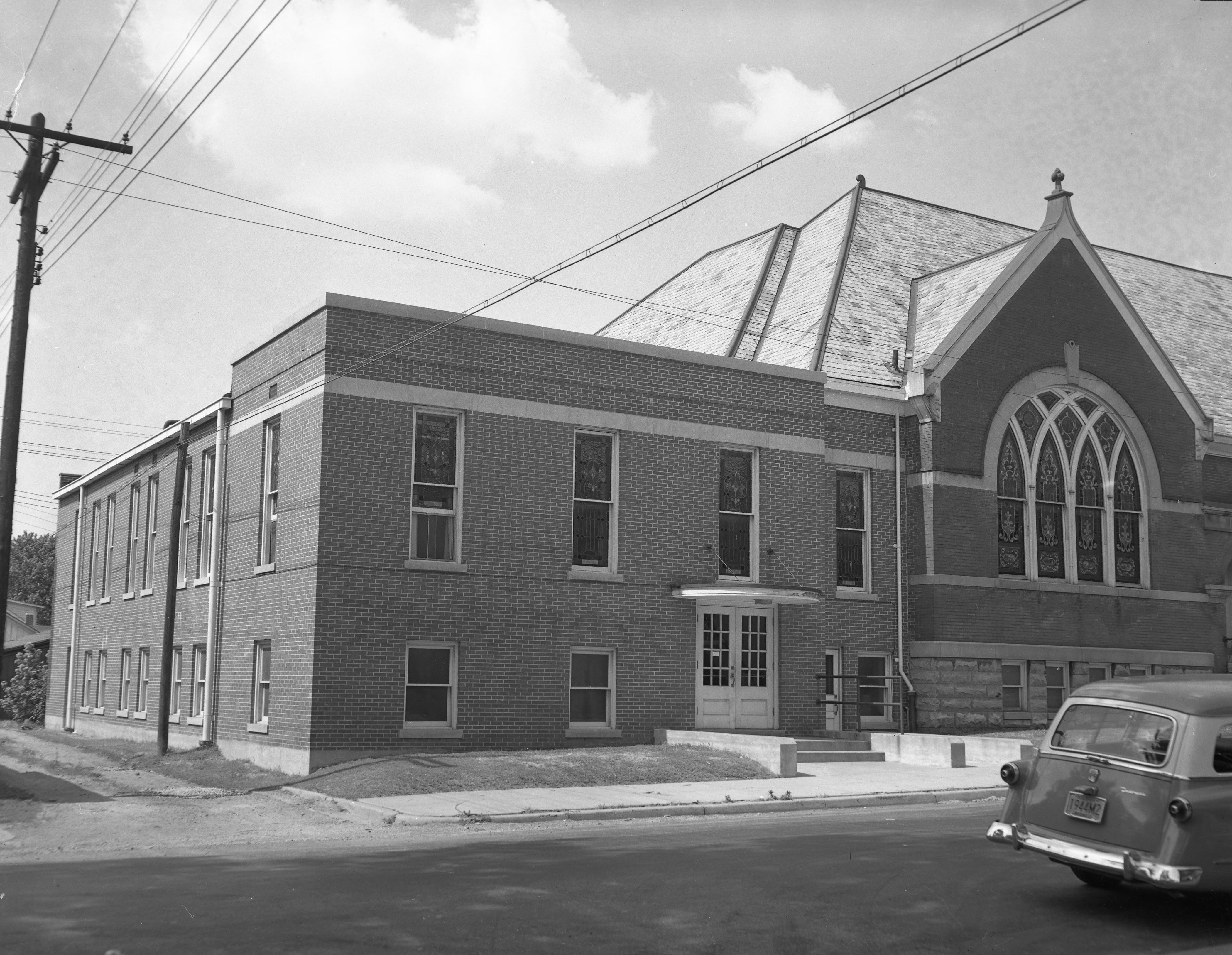 First Methodist Church at 601 Main St., on the corner with 6th St. This building was used from 1905-1957. Today a newer building of First United Methodist Church occupies this location.