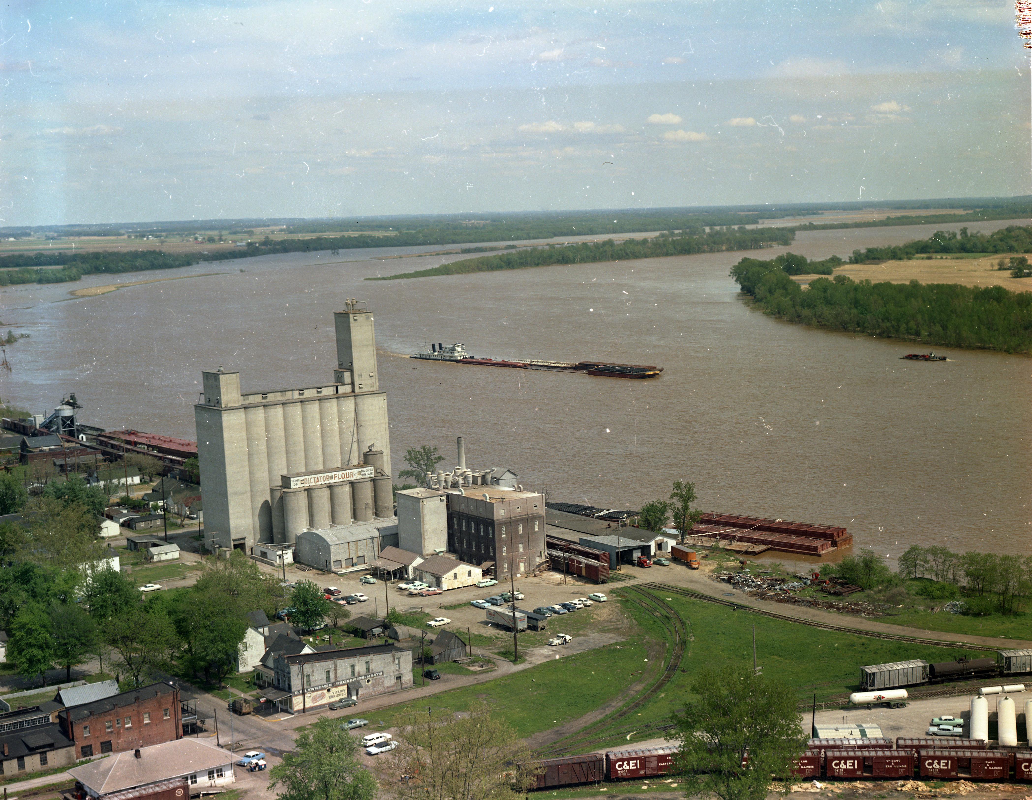 Aerial view of Fuhrer-Ford Milling Company, now ADM (Archer Daniels Midland) at 614 W. 2nd St. (identification from Posey County Historical Society Facebook posting) Barge and towboat on Ohio River.