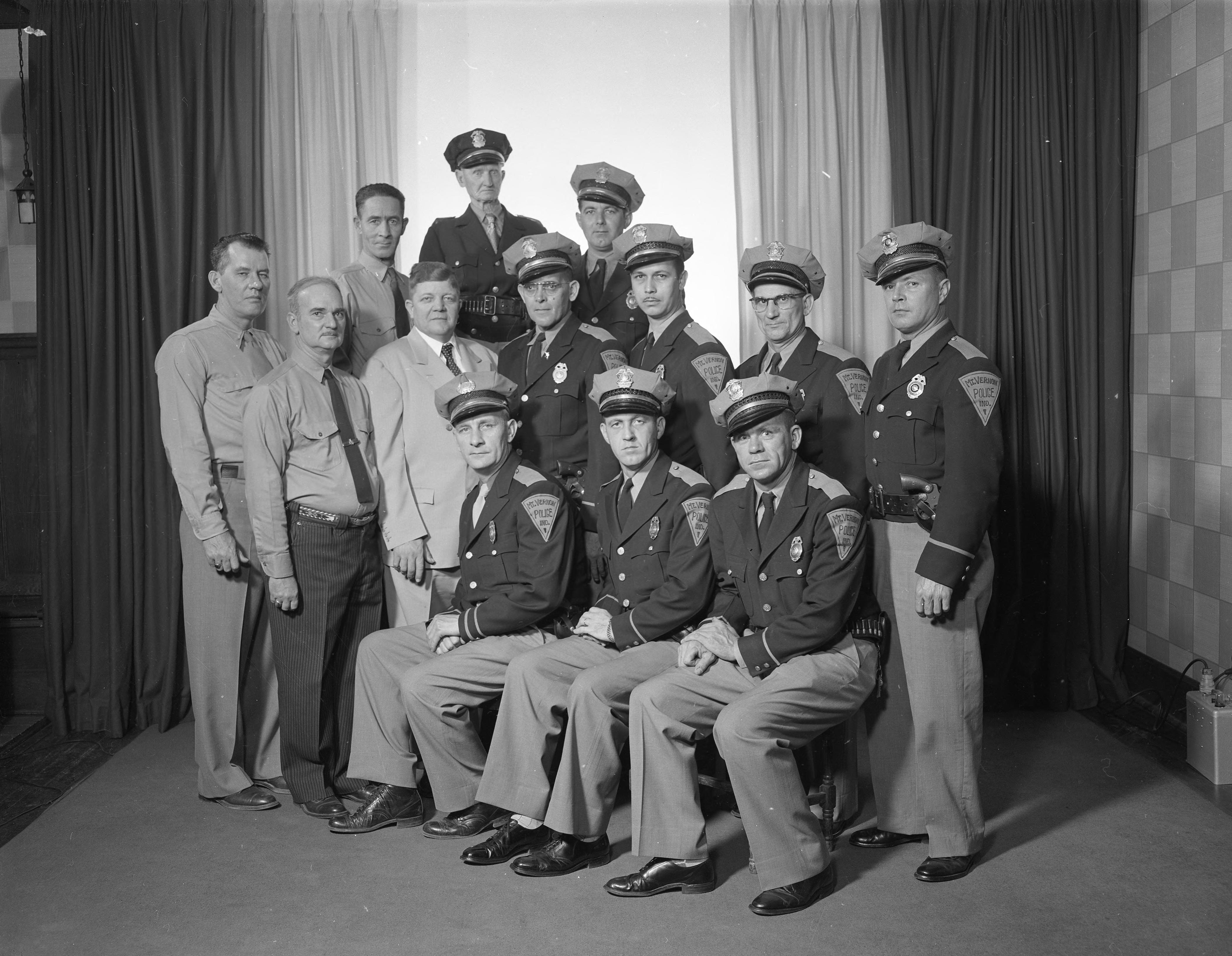 Mayor Percy Bartlett and members of the the Mt. Vernon Police Department. There is a Percy D. Bartlett (1908-1980) buried in Bellefontaine Cemetery, but this cannot be regarded as positive identification.