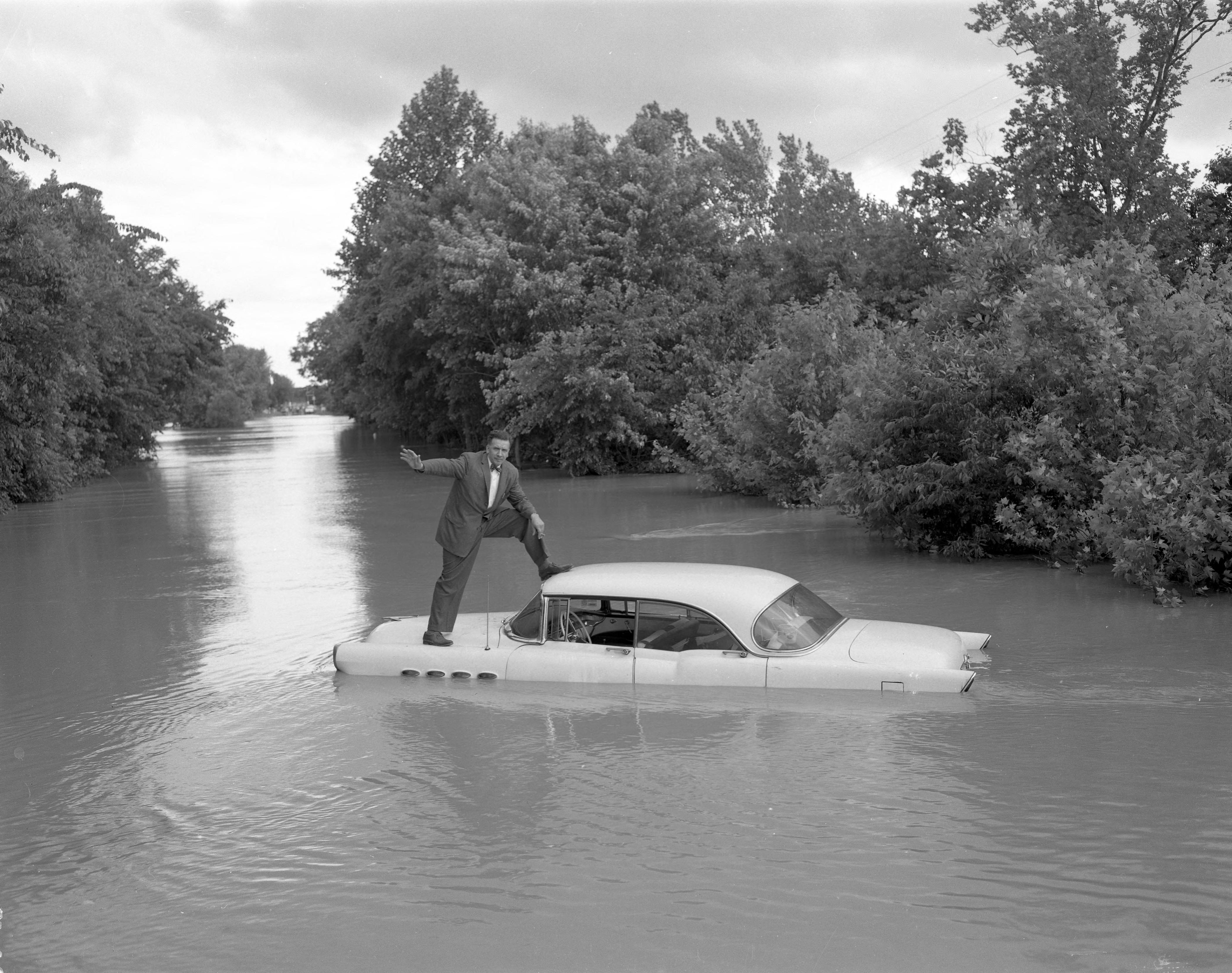 Man in suit atop a submerged car--identified as from Big Creek overflow. Big Creek runs across the northern part of Posey County and empties into the Wabash River.