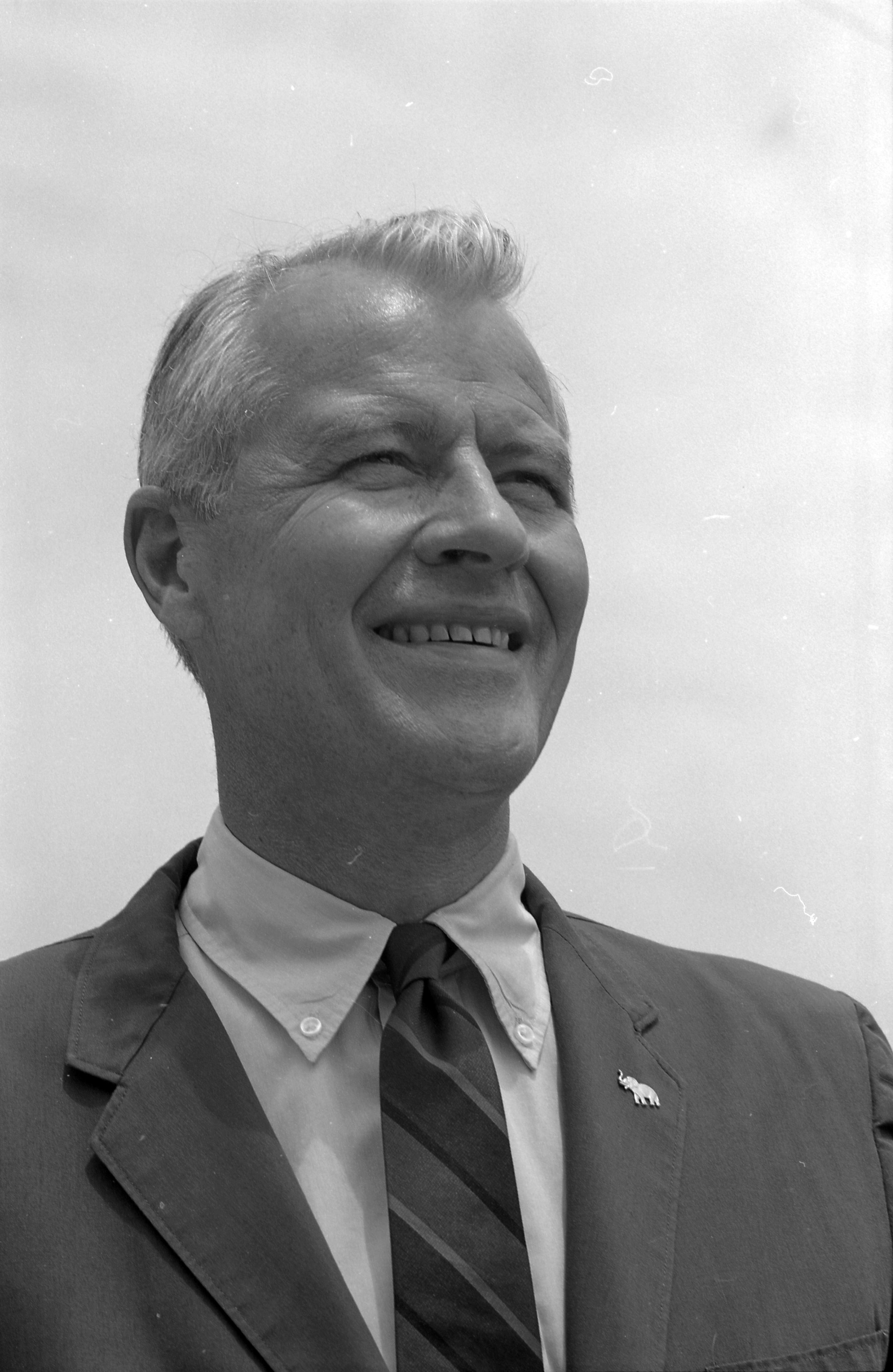 Robert Orr, former state senator and governor of Indiana in front of the Mt. Vernon Courthouse.