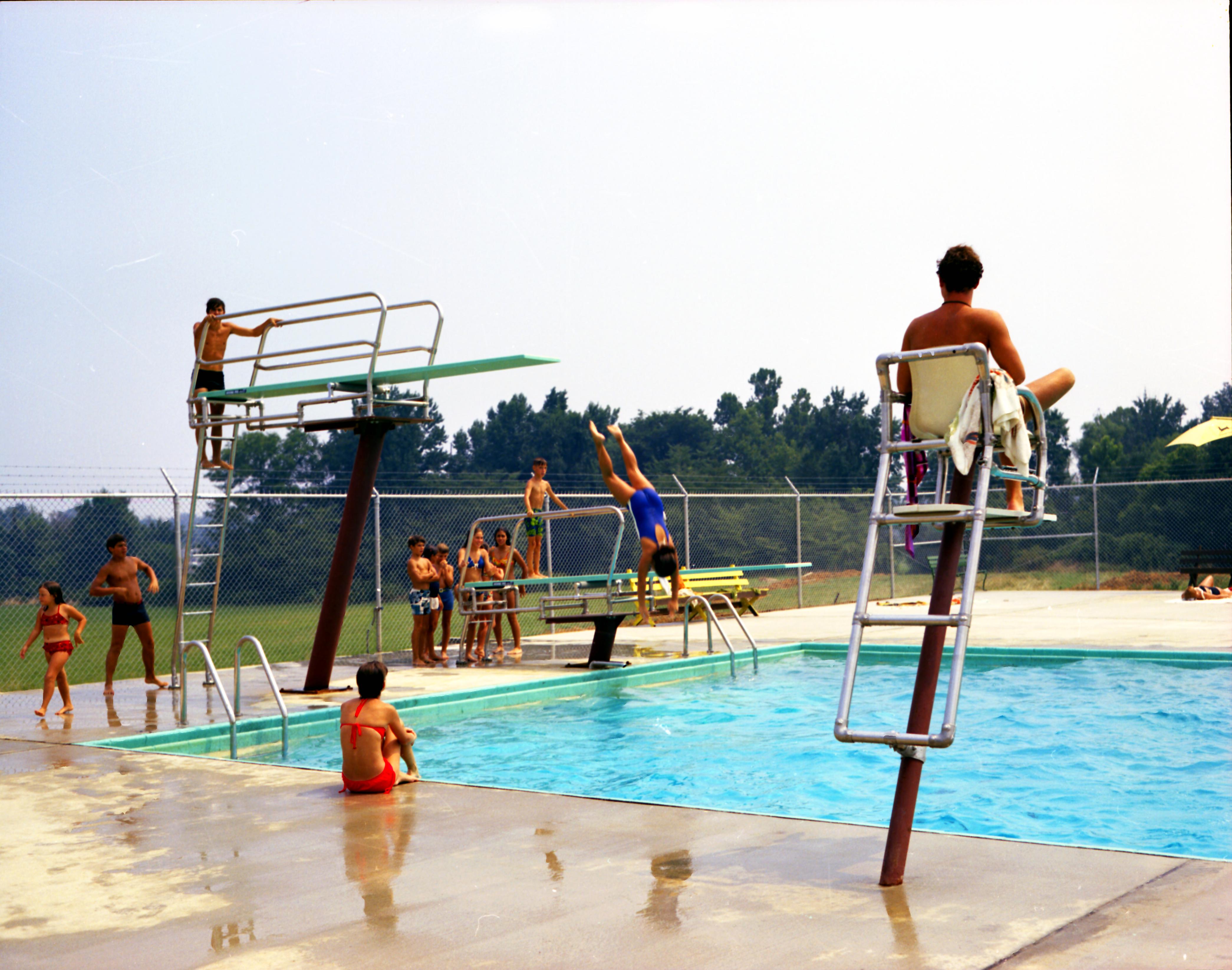 People swimming in the Brittlebank Park public pool. In the background is Farm Bureau Refinery