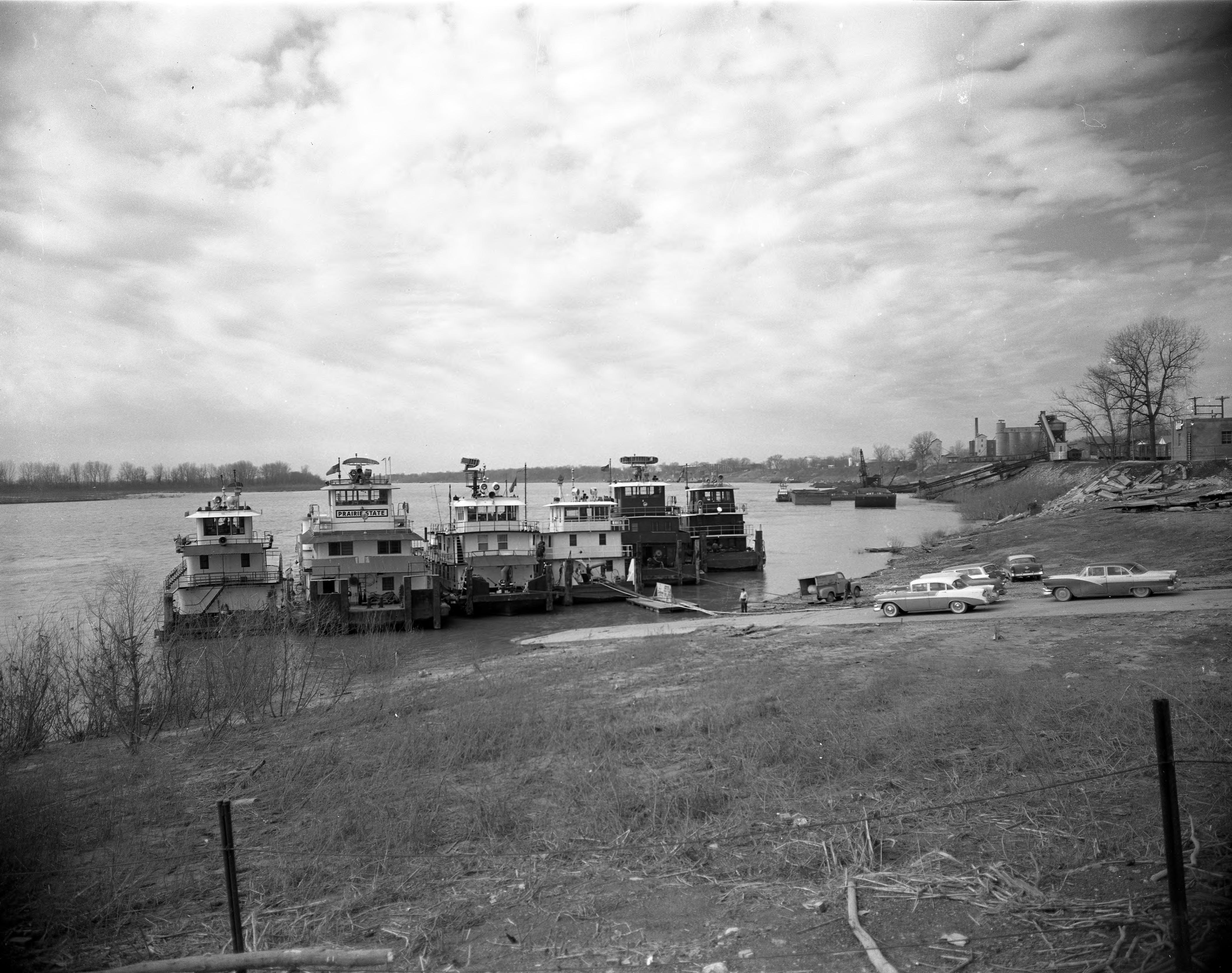Six tugboats anchored at Mt. Vernon river landing: from left, the Willie B., the Prairie State, the A.L. Mechl??, the Quachata, the Moran Inland Waters, and the David E. Moran.