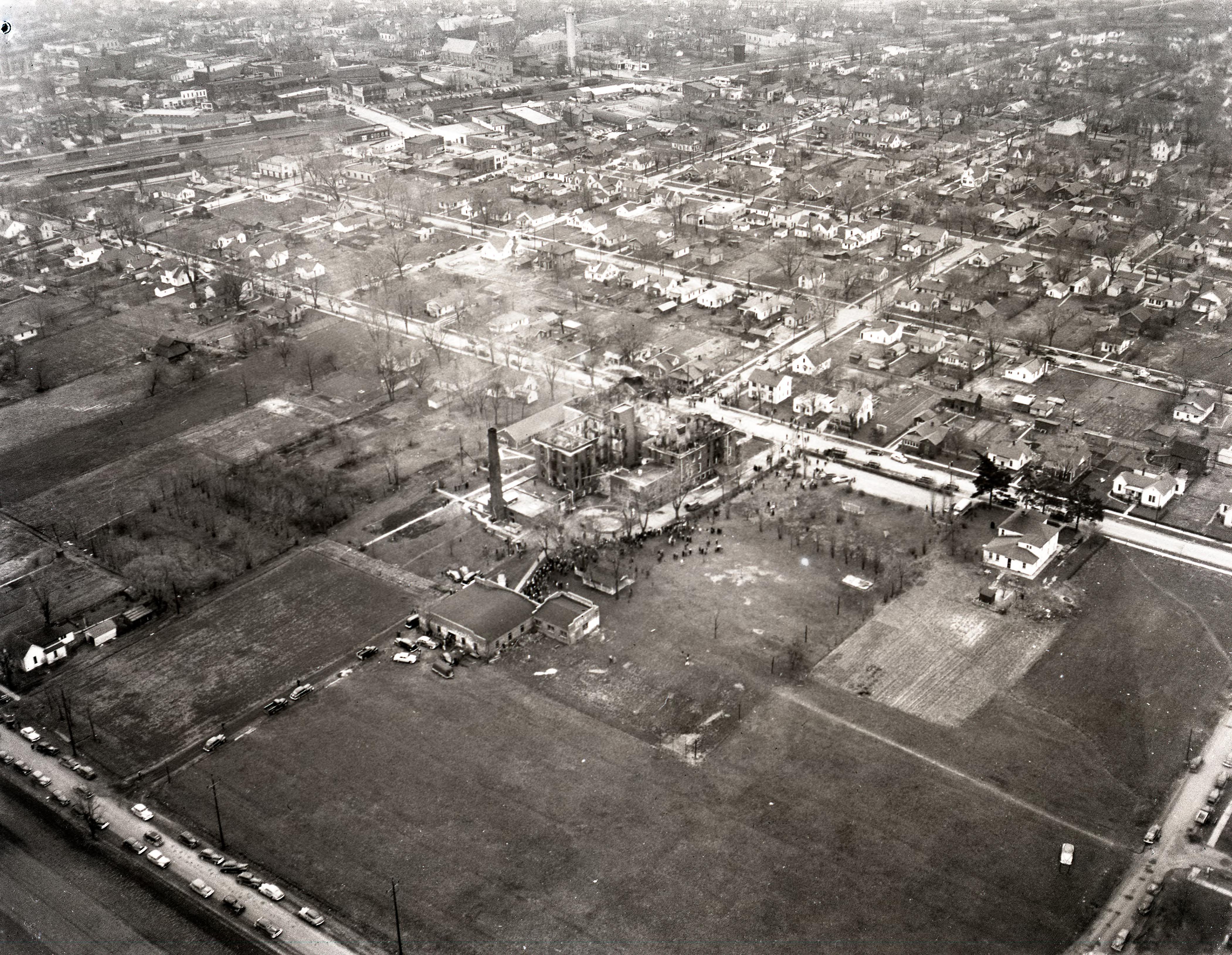 Aerial view of St. Anthony's Hospital fire. St. Anthony's Hospital in Effingham had been the county's only hospital since 1873, but in 1949 the region was quickly outgrowing the small facility. Operated by the Sisters of St. Francis, who lived in a convent next door, the hospital was sanitary and well-kept, but completely outdated. Constructed mainly out of wood and brick, the 100-bed hospital contained open corridors and staircases and many of the walls were covered with oilcloth fabrics and combustible soundproof tiles. The city was planning to build a larger, modern hospital in 1951, but tragedy struck on April 4, 1949. Shortly before midnight, a massive fire broke out at St. Anthony's Hospital, spreading rapidly through the building. As the hospital had no architectural components that controlled fire, the flames easily burned through the wood and plaster interior. Many of the 116 patients were immediately trapped on the upper floors, including disabled elderly residents, injured patients stuck in casts, splints, and traction devices, and a nursery full of newborn babies. A few brave doctors and nurses helped some escape, returning to the burning building multiple times to rescue patients, but the fire was too strong. Ultimately, 74 people were killed, including patients, nurses, nuns, a priest, and a hospital superintendent who ran into the flames to try to rescue his wife. As the hospital had no fire alarm system, valuable time was lost before someone was able to set off the town's fire siren. All but one of the 26-man Effingham Volunteer Fire Department arrived within ten minutes of hearing the siren, but by that time the fire had already burned through the hospital roof. Rescue efforts were further impeded as the small department had only three pumping engines. Until mutual aid departments arrived on scene hours after the blaze started, the firefighters had no ladder truck or other aerial apparatus to use to rescue victims from the otherwise inaccessible upper floors of the hospital. In the end, with the assistance of eleven mutual aid departments from as far away as 66 miles, firefighters were able to keep the fire from spreading elsewhere, but the hospital was virtually destroyed. Although the cause of the fire remains unknown, investigators had little trouble pinpointing the safety deficiencies at St. Anthony's Hospital. The combination of the combustible building materials in the open corridors, stairwells, and vertical shafts, along with the lack of fire sprinklers, detectors, and alarms had essentially doomed the hospital as soon as the fire began. In response, Governor Adlai Stevenson ordered the State Fire Marshal to evaluate all of Illinois' hospitals to pinpoint and correct any fire hazards. Many other hospitals throughout the country also improved their fire safety measures in an effort to avoid similar disasters. In fact, as a direct result of the fire at St. Anthony's, modern hospitals now incorporate numerous fire safety features to protect patients who cannot be quickly evacuated, including fire barriers, smoke compartments, and stairway enclosures. (https://guides.library.illinois.edu/c.php?g=416856&p=2840529) Today a modern HSHS (Hospital Sisters Health System) St. Anthony's Memorial Hospital stands at 503 N. Maple St. It opened in 1954 and was named Memorial to honor the fire victims.