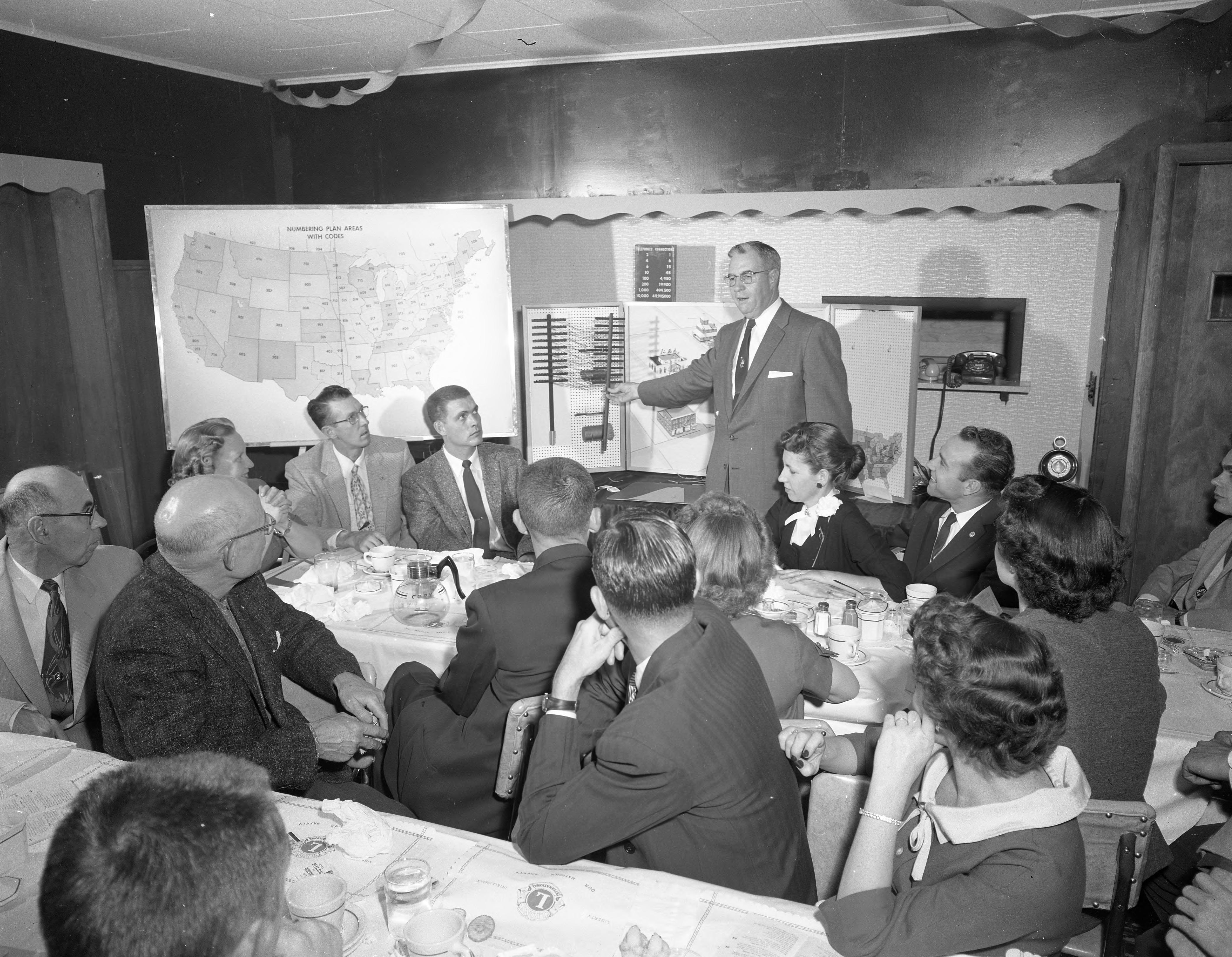 Speaker presenting program to Lions Club members. The map on the wall is for area codes. The speaker is showing new telephone poles that are being installed in the county.