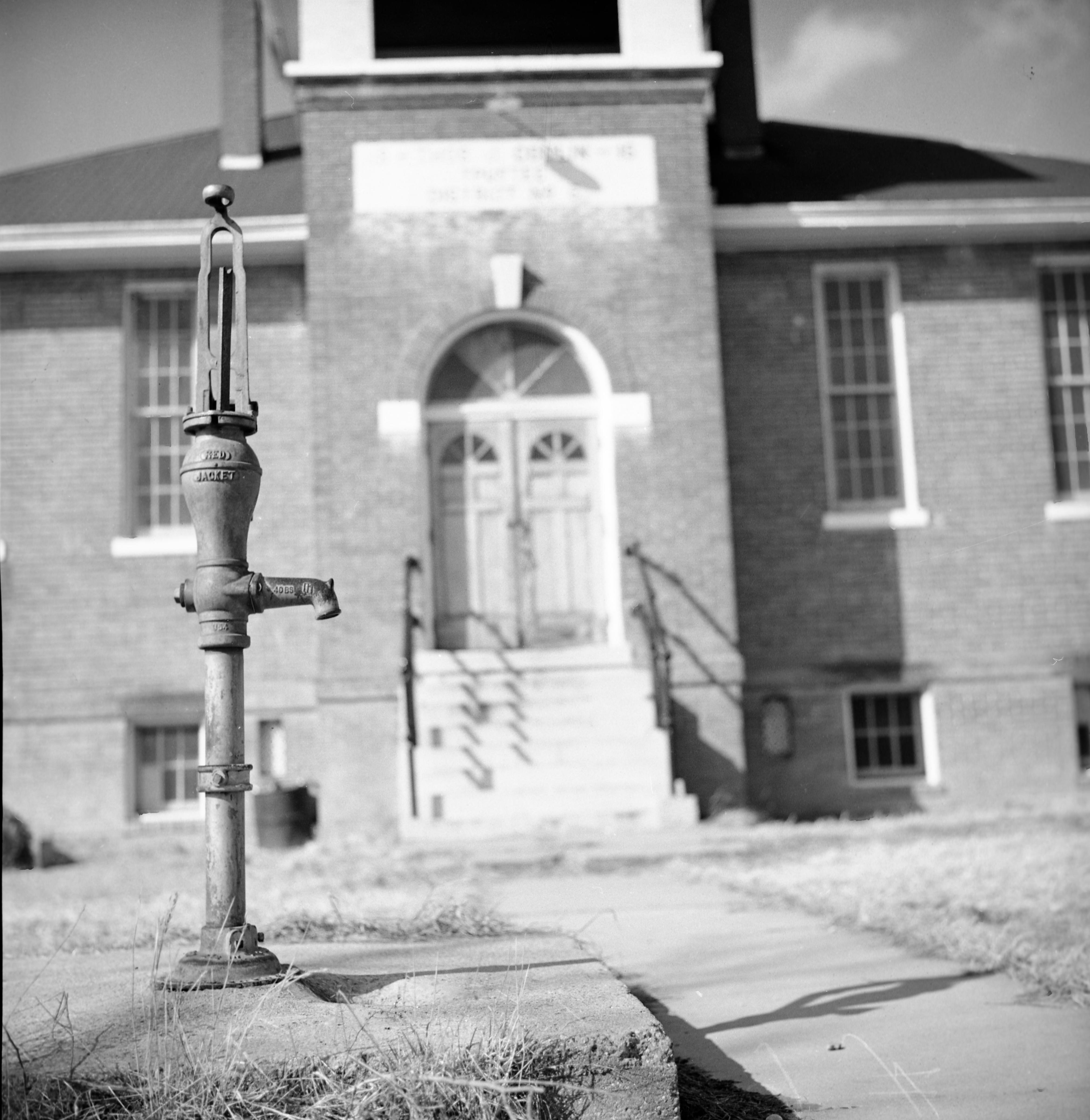 Water pump in front of Black Township School No. 8 on Mackey Ferry Rd., c. 1900.