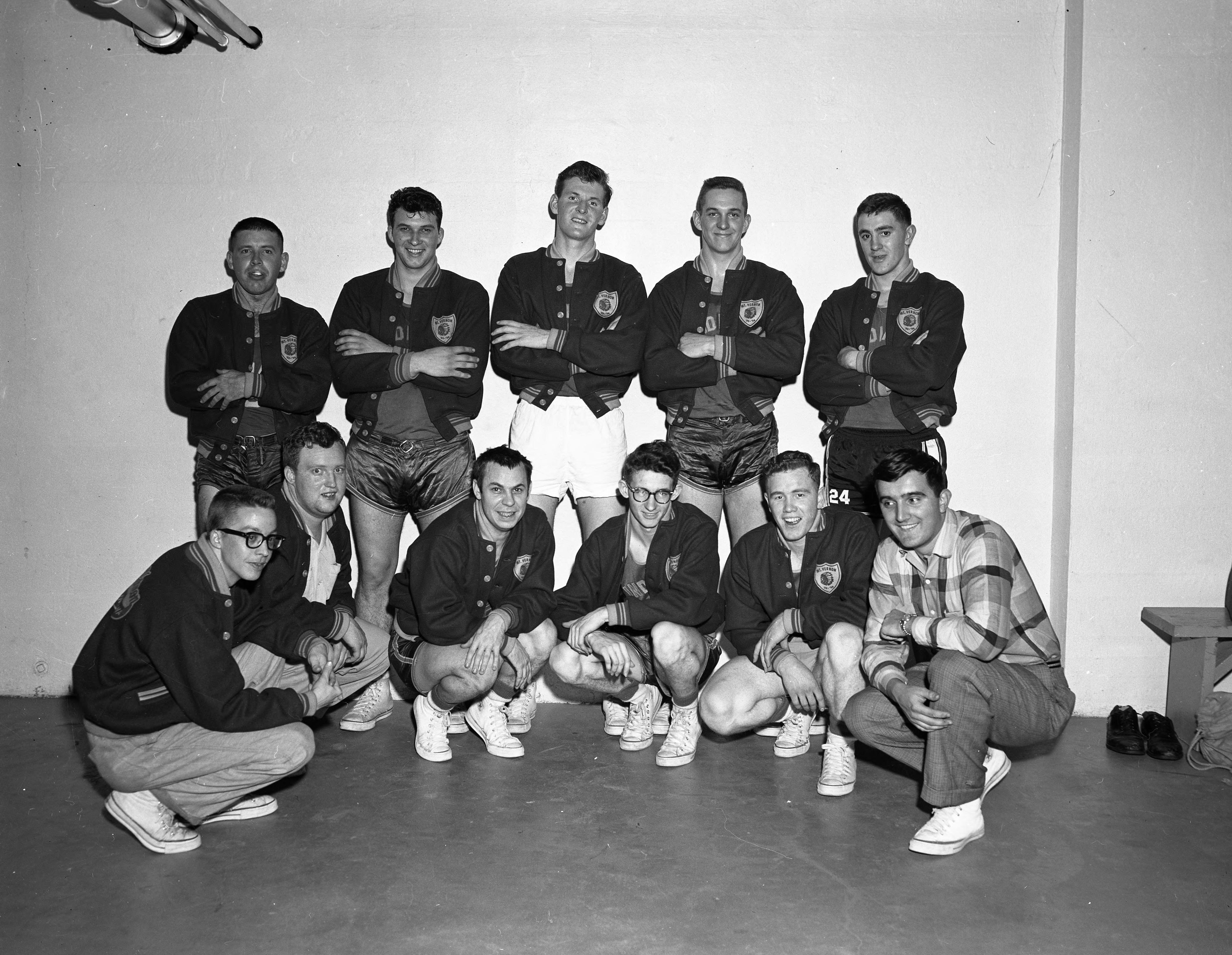 Basketball team from Mount Vernon, IN. This was an idependent adult team that travels the tri-state. Top Row (L to R)unknown, unknown, unknown, unknown, Richie Moore. Bottom Row (L to R) Ron Bennett, Waxey Walker, unknown, unknown, Will (?) Thomas, Jackson Higgins.