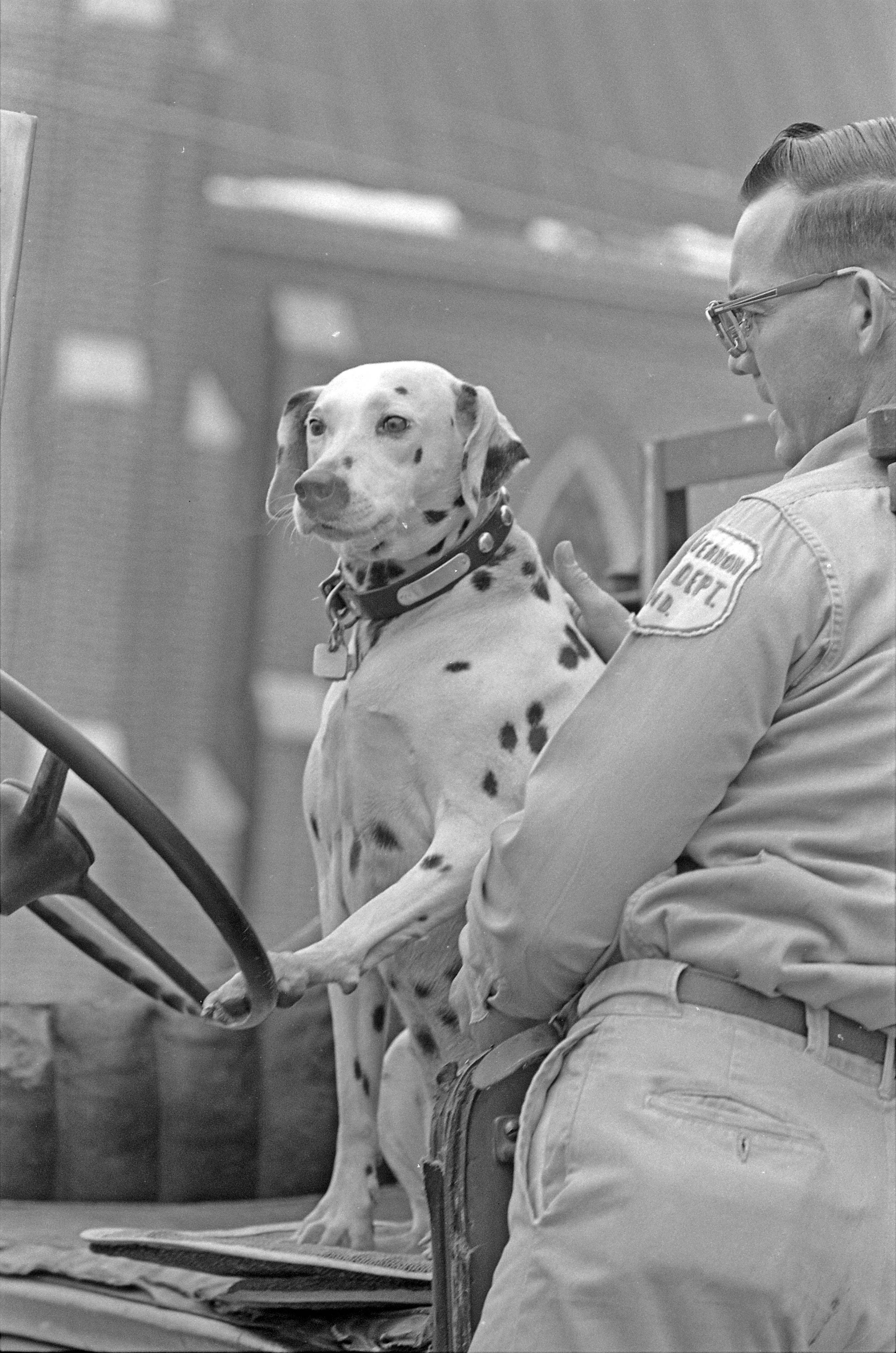 Dot, the dalmation mascot for the fire department, ontop of firehoses
