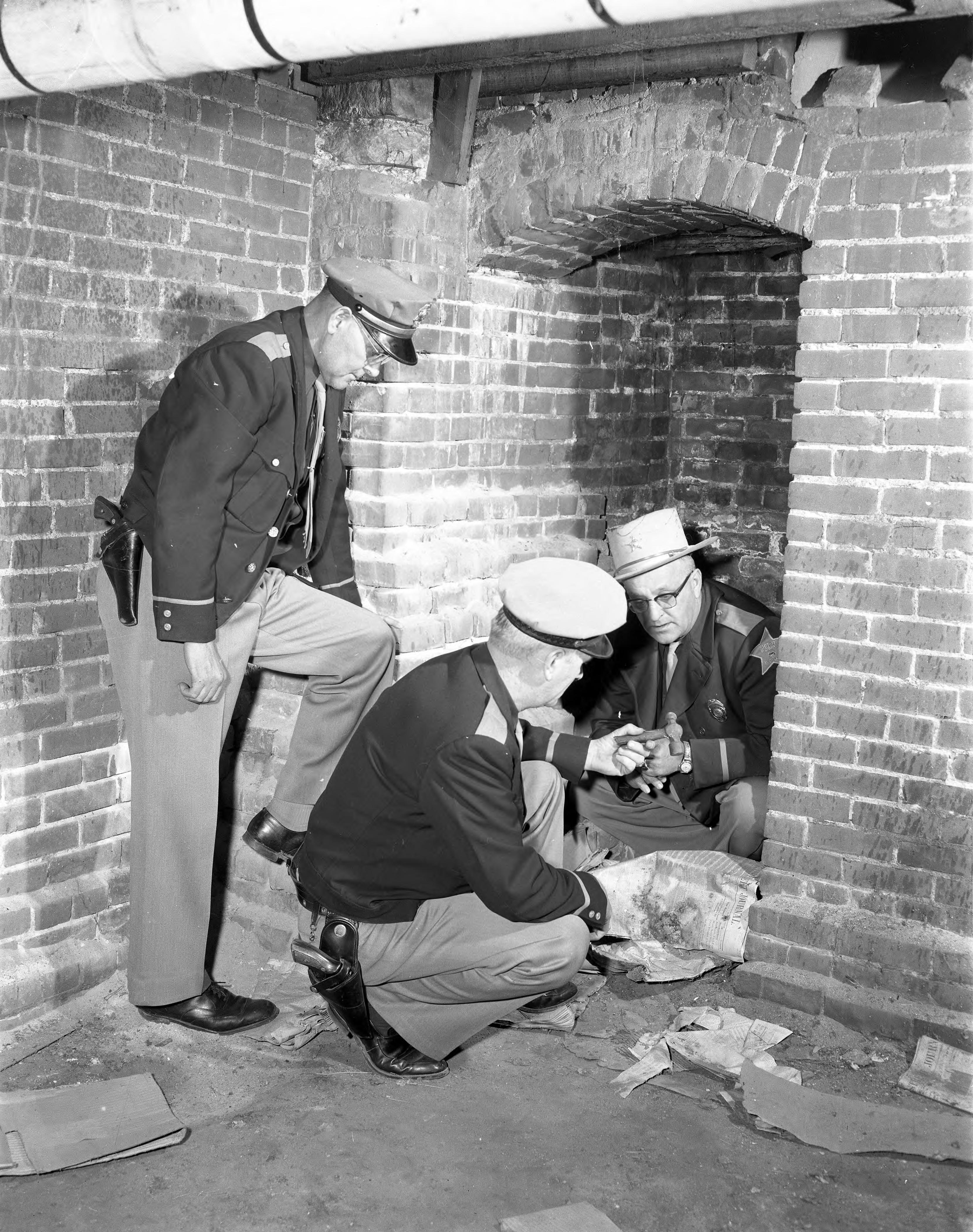 Identified as a bank robbery investigation, with officers looking at a hammer. They are in a brick basement setting.