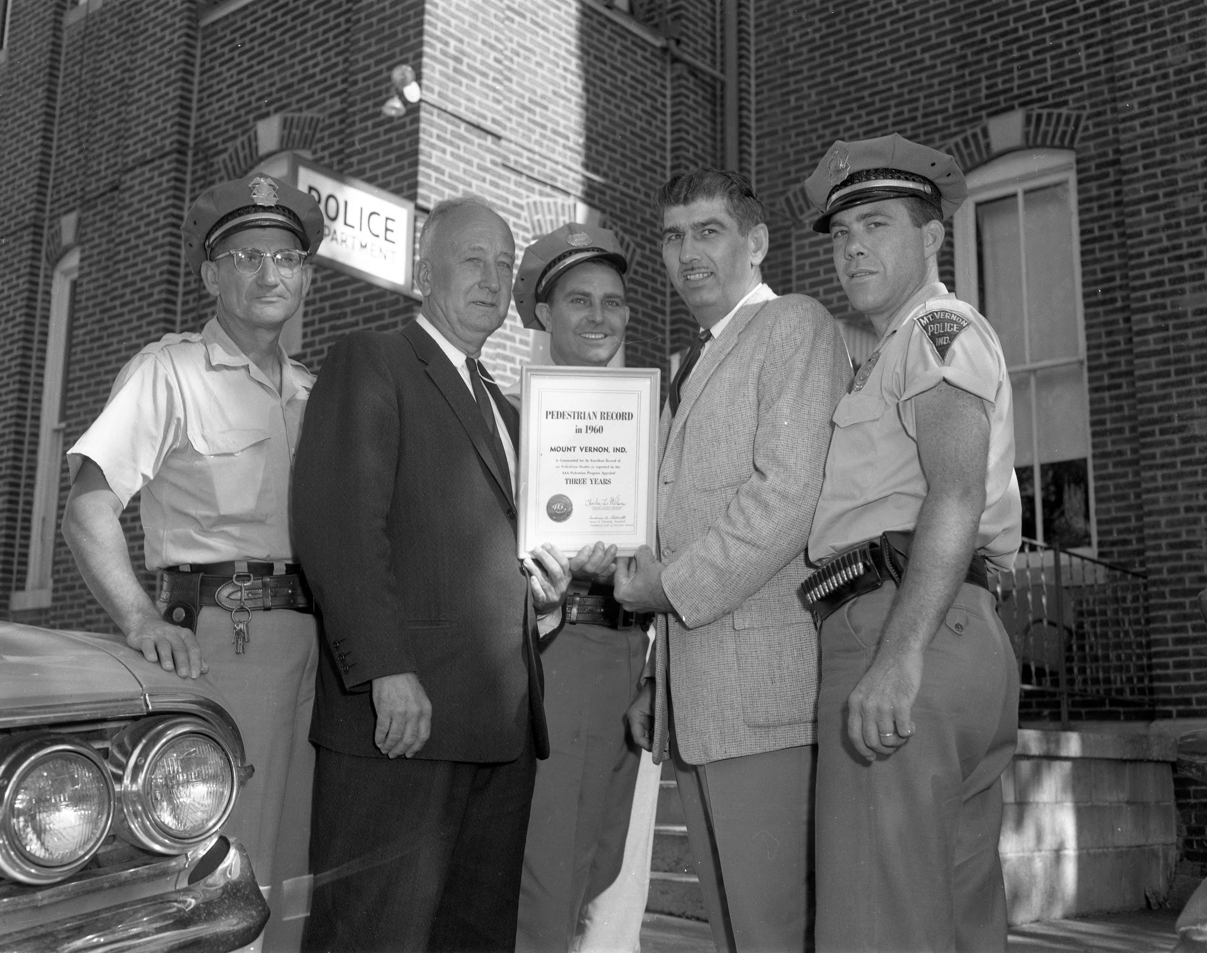 Standing outside the police dept., officers and officials accept the Pedestrian Record for 1960, presumably for pedestrian safety. The police department is currently at 311 College St. , but this is its former location at the corner of E. 6th St. and Main St., which no longer stands.