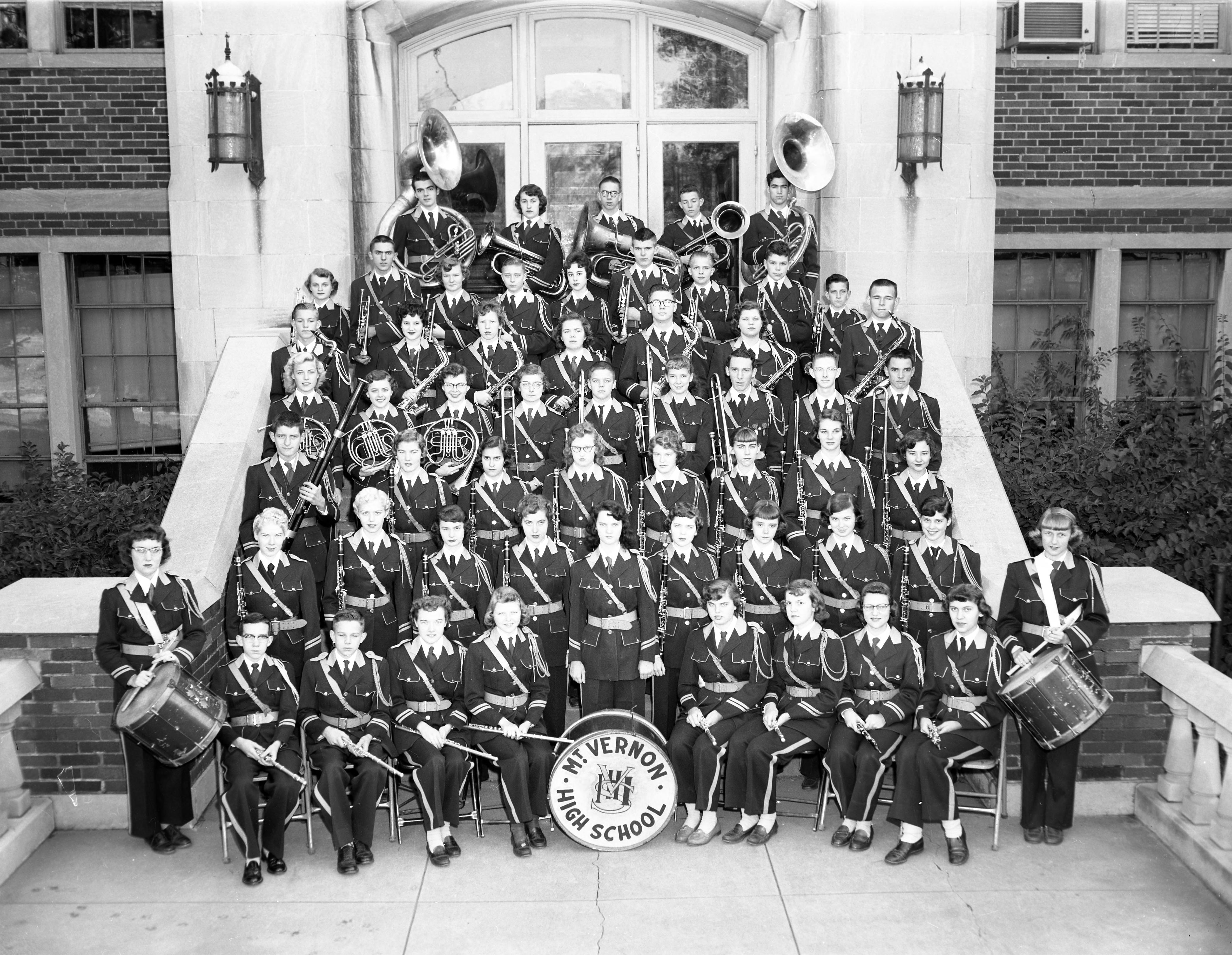 Mount Vernon High School band posing on the steps of the school. This building served as the high school from 1929-1961, and then as the junior high school until the spring of 1991. The location was 614 Canal St., now an open field as this has been razed.