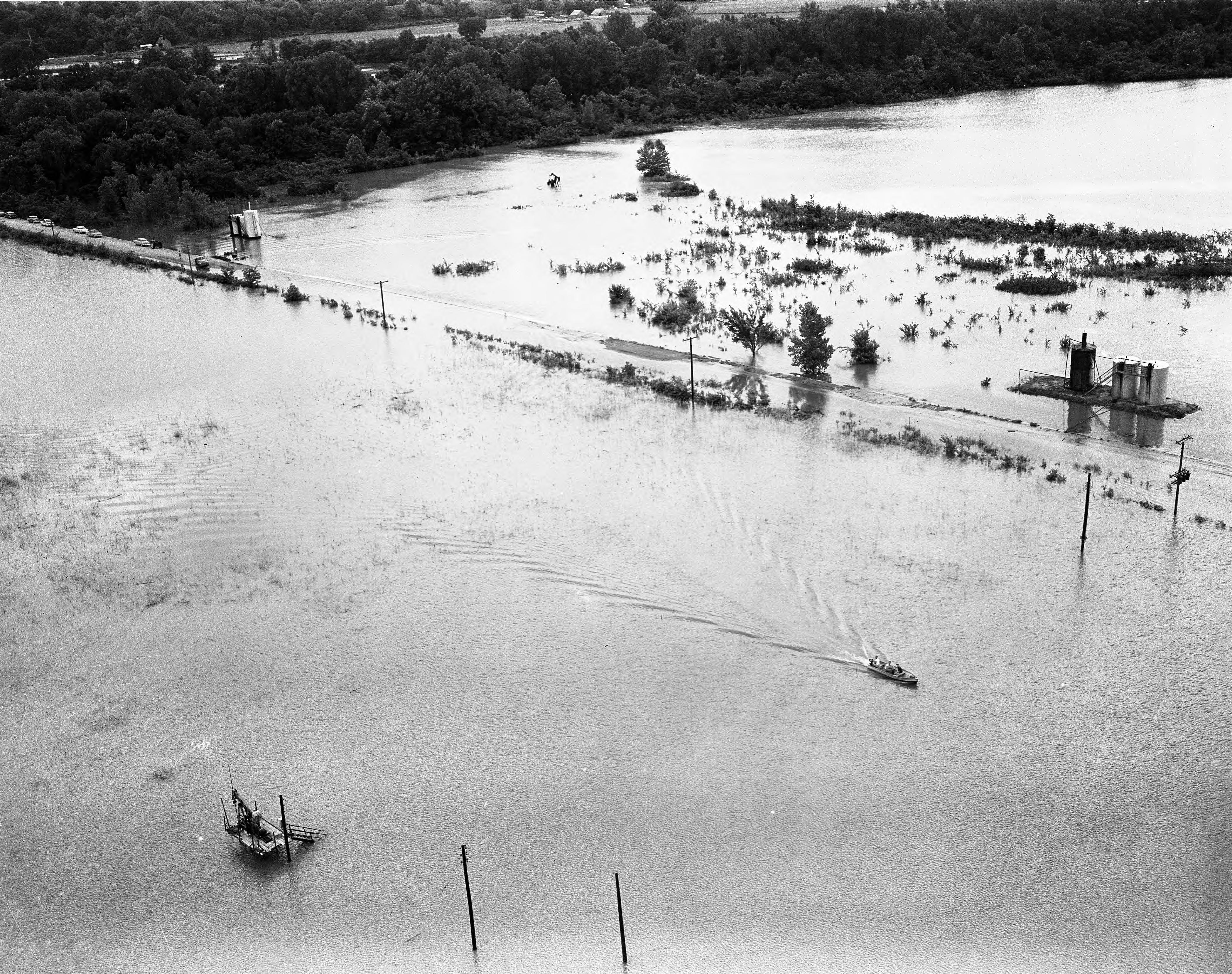 Flooding in Griffin, IN information from the July 3, 1957 issue of The Evansville Courier reported that the river was expected to crest, far above the 21 ft. level which already would have flooded fields of corn and soybeans. It was hoped that since the crest was not to take place until the following Saturday, there would be time for an all out effort to raise the levees would be successful, but since such a long stretch of the levee needed to be raised, it was thought problematical.
