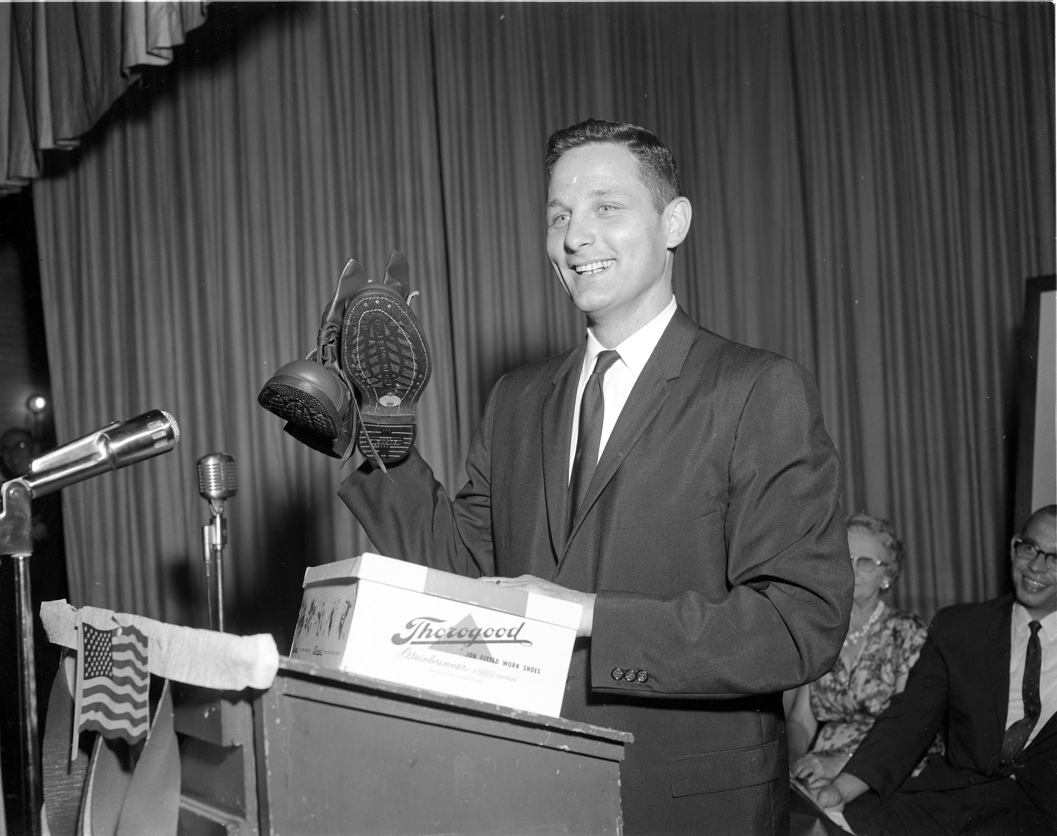 Birch Bayh at a lectern holding a pair of work boots. Bayh was elected in the 1962 mid-term elections to the U.S. Senate and served 1963-1981.