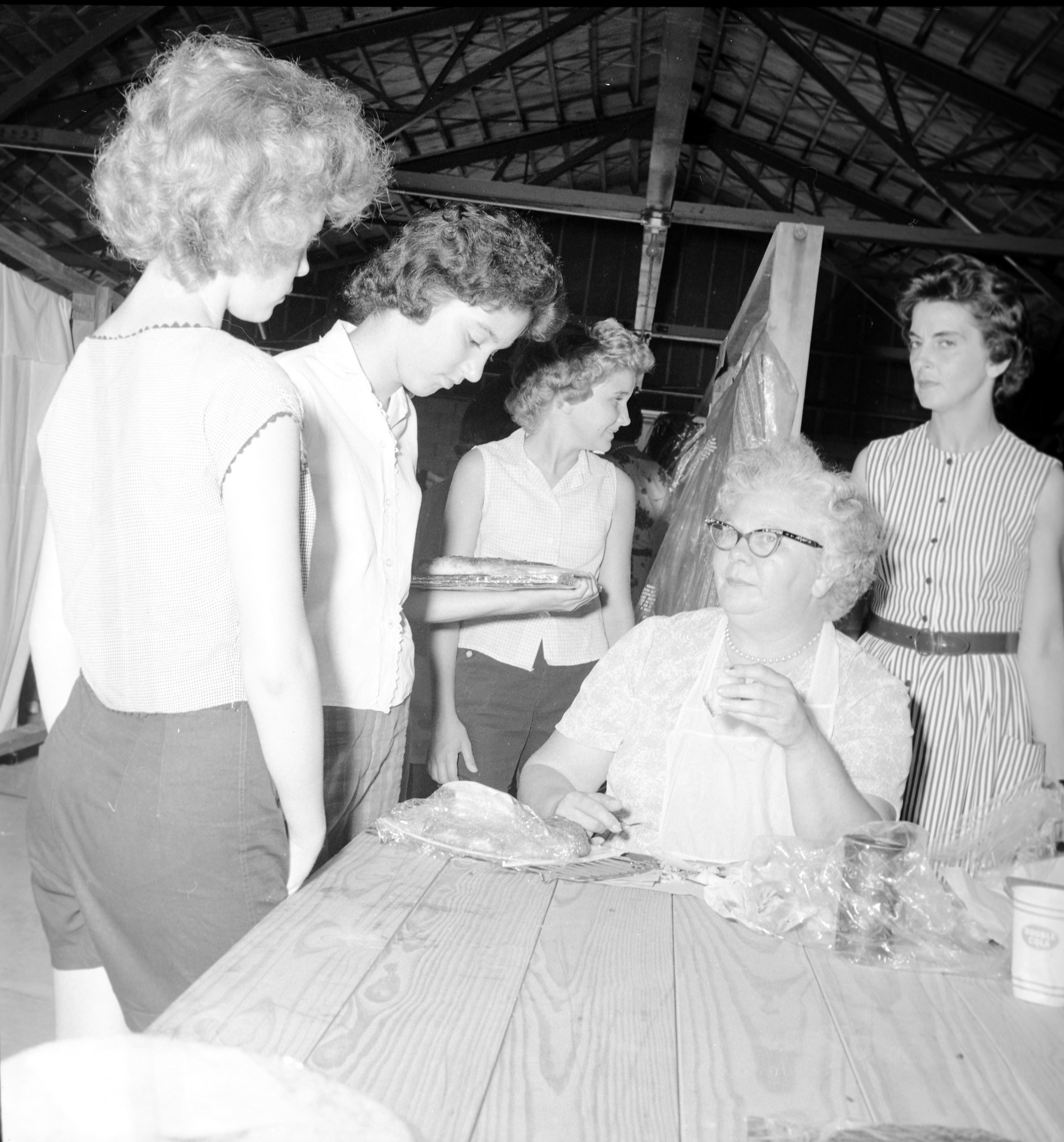 Three girls and a woman surround an older woman sitting at a table, eating something. There is a Double Cola cup nearby. Taken with MSS 022-3141 and 3150, this might be a 4-H fair contest