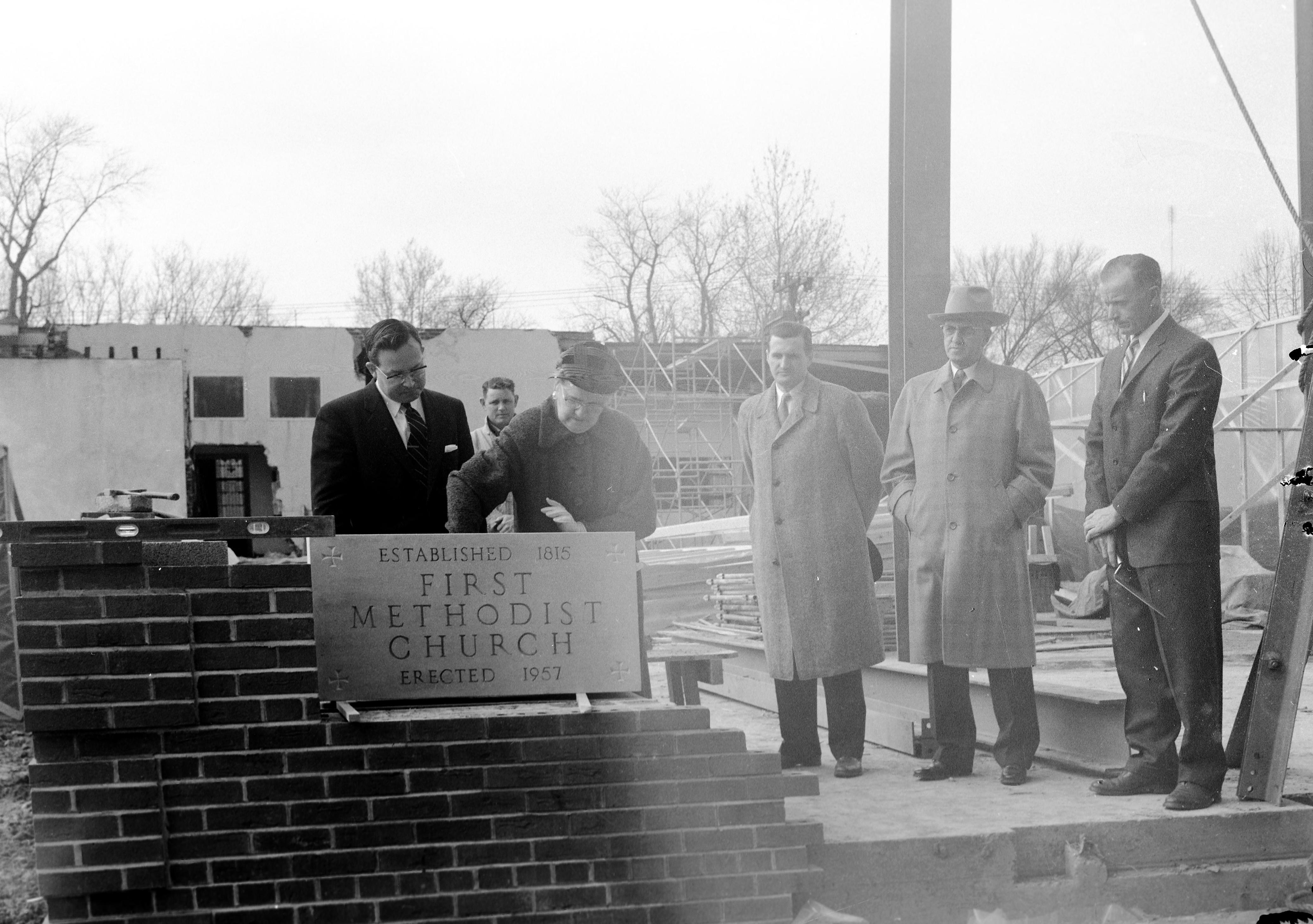 Cornerstone of the First Methodist Church at 601 Main St., on the corner with 6th St. This is the 1957 construction, the current church. Here a woman is laying a brick.