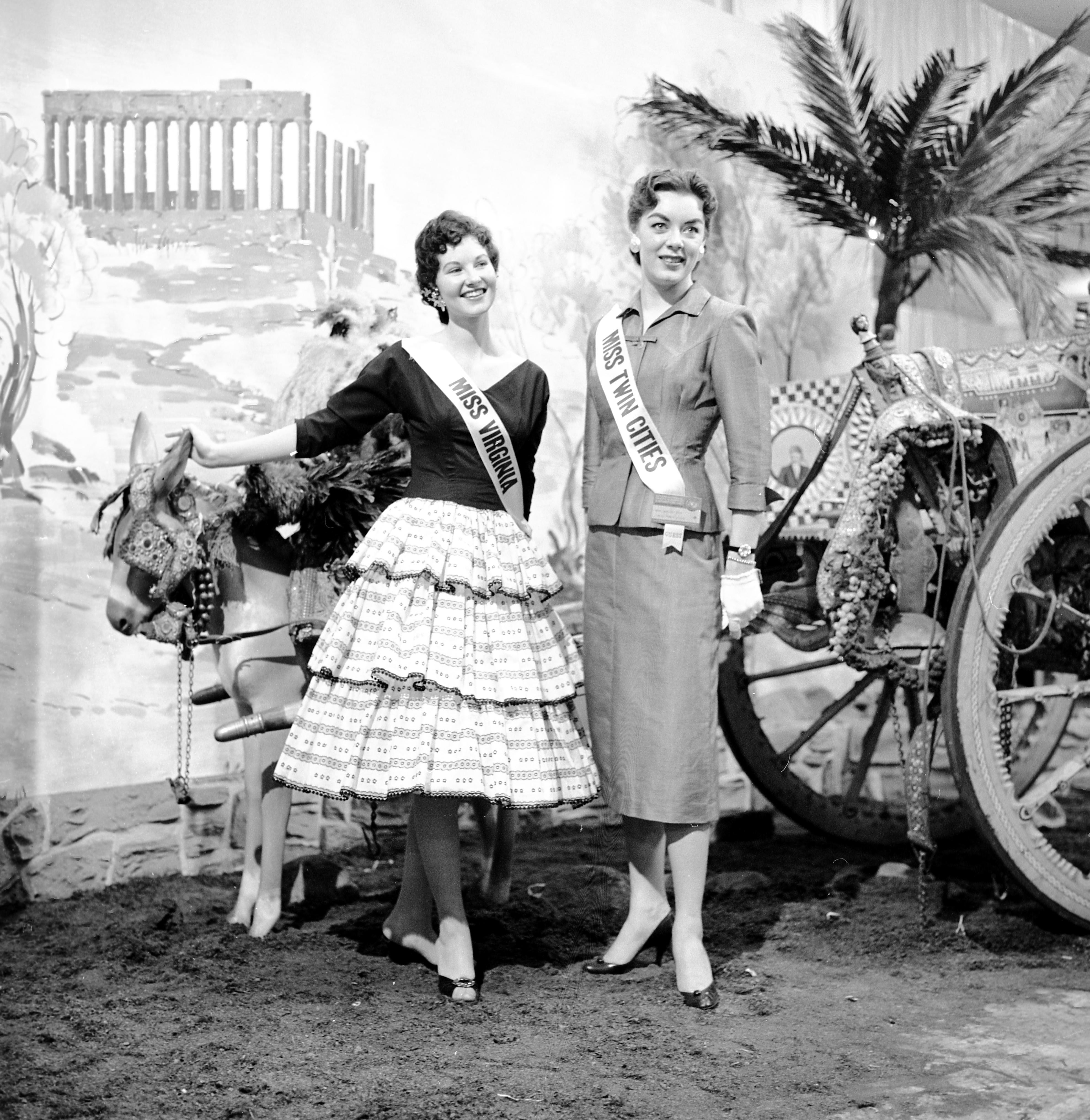 Two young women wearing sashes identifying them as Miss Virginia and Miss Twin Cities,standing in front of a theatre backdrop
