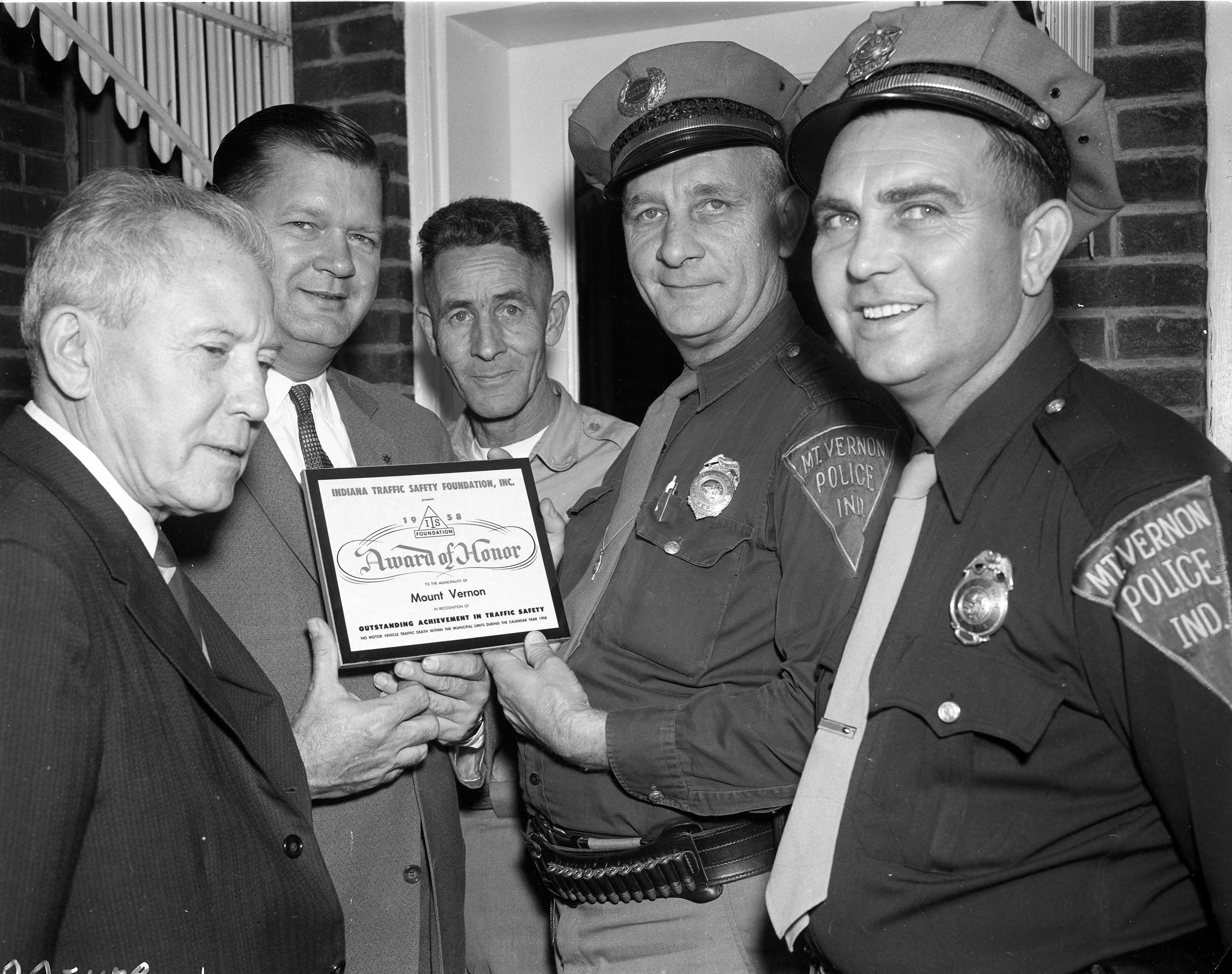 Presentation of the Indiana Traffic Safety Foundation, Inc. award to the city of Mount Vernon---being accepted by members of the police department