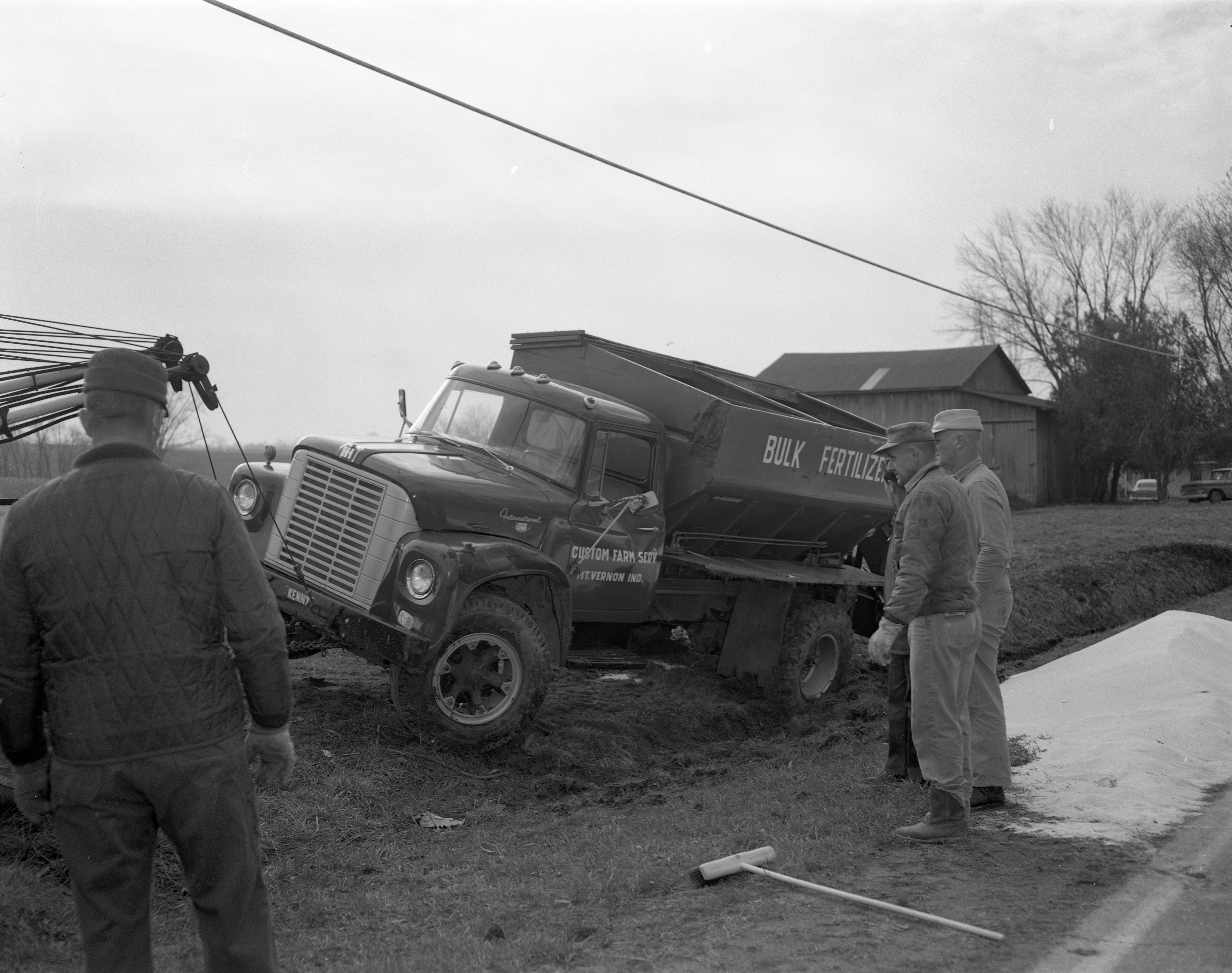 Custom Farm Service truck ready to be towed from the scene of what was identified as a fatal accident�.no more details were provided. The tow truck is from Nix Chevrolet Co.