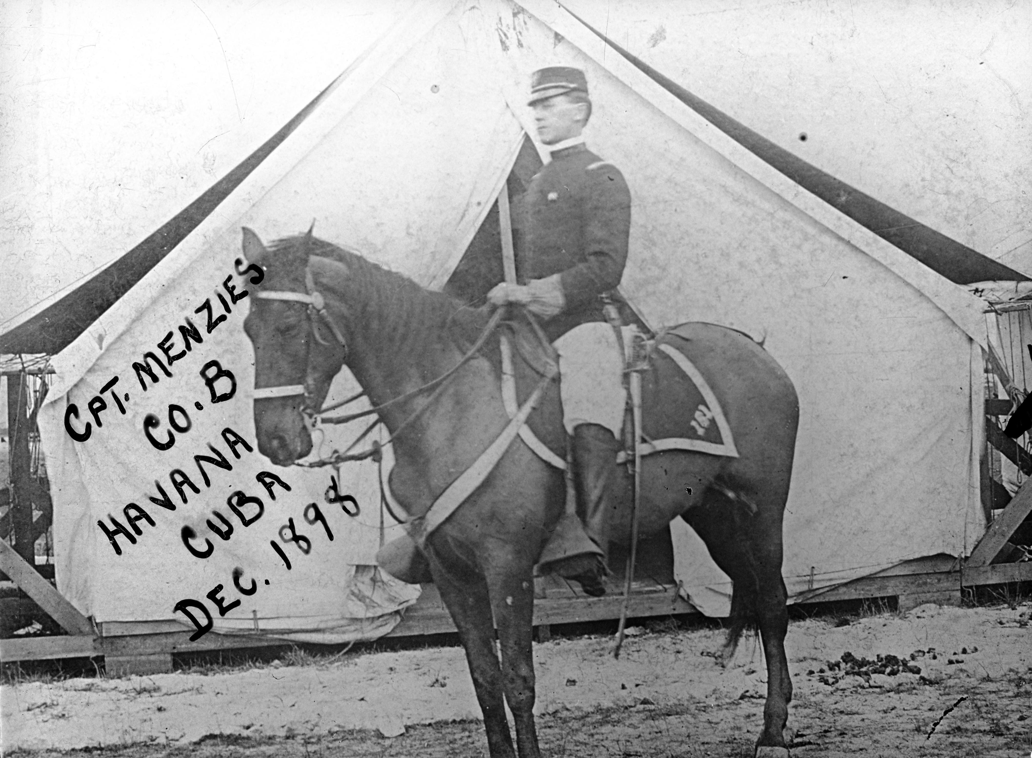 Captain Menzies of Company B in Havana, Cuba. December 1898, Capt. Winston Menzies, editor and proprietor of the Evening and Weekly Sun, Mt. Vernon, is a native of Posey county, and a son of Maj. G. V. Menzies, born in Mt. Vernon November 22, 1876. He was educated in the public schools of Posey county and the New York Military Academy at Cornwall-on-the Hudson, New York. Later he entered the University of Indiana at Bloomington, Ind., graduating in the class of 1897. He then took up newspaper work, and was reporter on the Daily Democrat one summer. He then went to St. Louis, and was employed on the Republic staff until the breaking out of the Spanish American war. In April, 1898, he enlisted as a private in Company H, One Hundred and Fifty ninth Indiana infantry, and on July 11, 1898, was transferred to the One Hundred and Sixty first Indiana infantry, and commissioned captain of Company B. His regiment was sent South, assigned to the Seventh army corps, under Gen. Fitzhugh Lee, and served through the entire Cuban campaign. To Captain Menzies belongs the distinction of being the youngest captain in the Seventh army corps. He received his commission before he was twenty two. He was mustered out of the service in April, 1899, and returned to Mt. Vernon, again engaging in the newspaper work, this time as city editor of the Democrat. In 1901 he went to Fort Wayne, in the employ of the United Boxboard & Paper Company, and remained there until 1905, when he went to Indianapolis for the same company. In 1907 he again returned to Mt. Vernon, and became managing editor of the Evening Sun, which was organized at that time. In December, 1909, he bought the paper, and is now the sole owner. Captain Menzies was married April 30, 1901, to Miss Irma Wasem, eldest daughter of Louis Wasem, a prominent merchant of Mt. Vernon and Evansville. He was a son-in-law to Governor Alvin Hovey. To Captain and Mrs. Menzies has been born one child, Esther Hovey, born at Fort Wayne, February 4, 1902. Captain Menzies is a member of Camp Fee, Spanish American War Veterans, the Military Order of the Loyal Legion, and the Press Club of Indianapolis. From: History of Posey County, Indiana, John C. Leffel, Editor, Standard Publishing Company Chicago 1913. p. 218