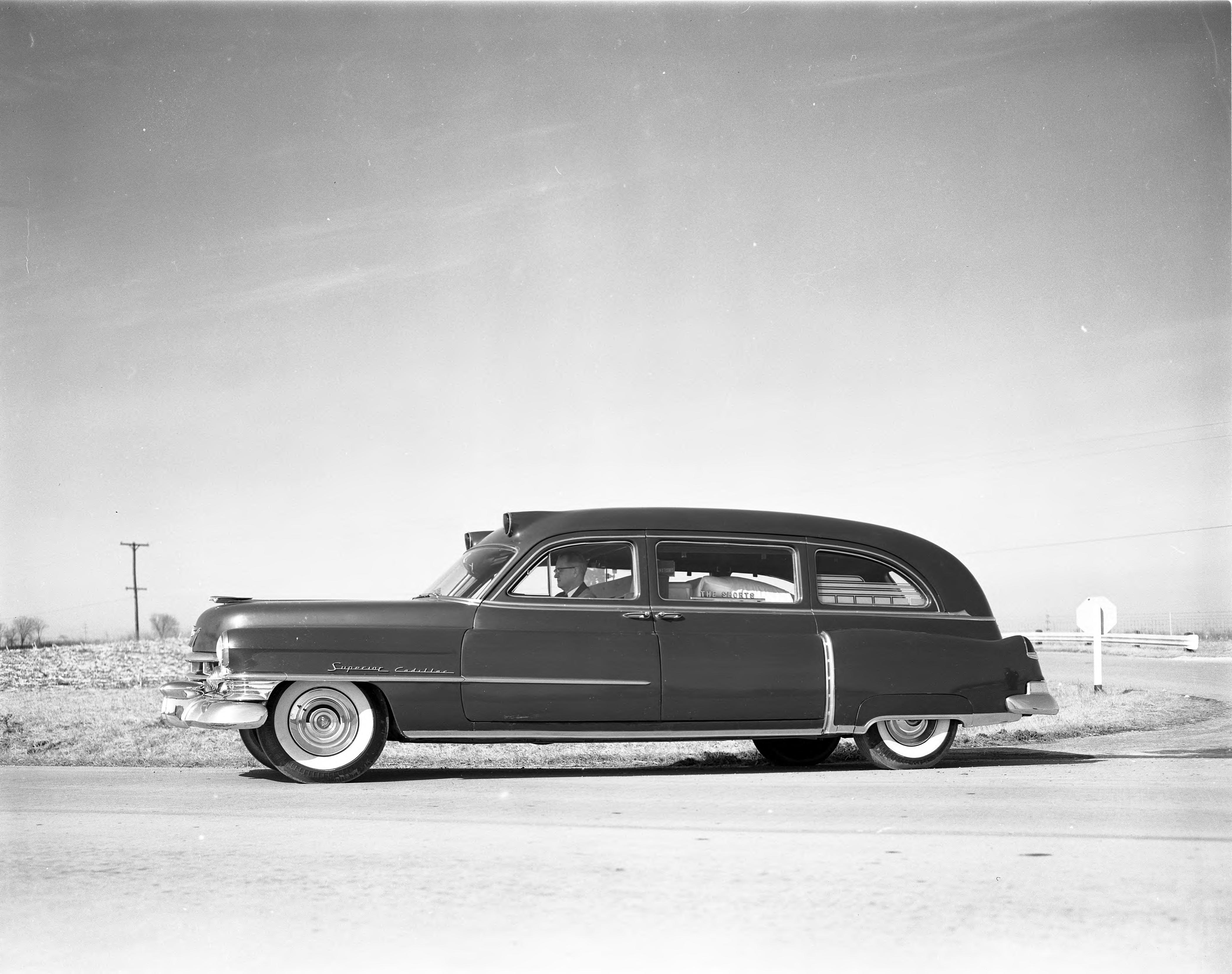 Hearse from Short's Funeral Home. The funeral home began in 1920 at 512 Main St., with the family living next door. Today this is Schneider Funeral Home. The building on the left here is the old Alexandrian Public Library, now city hall.