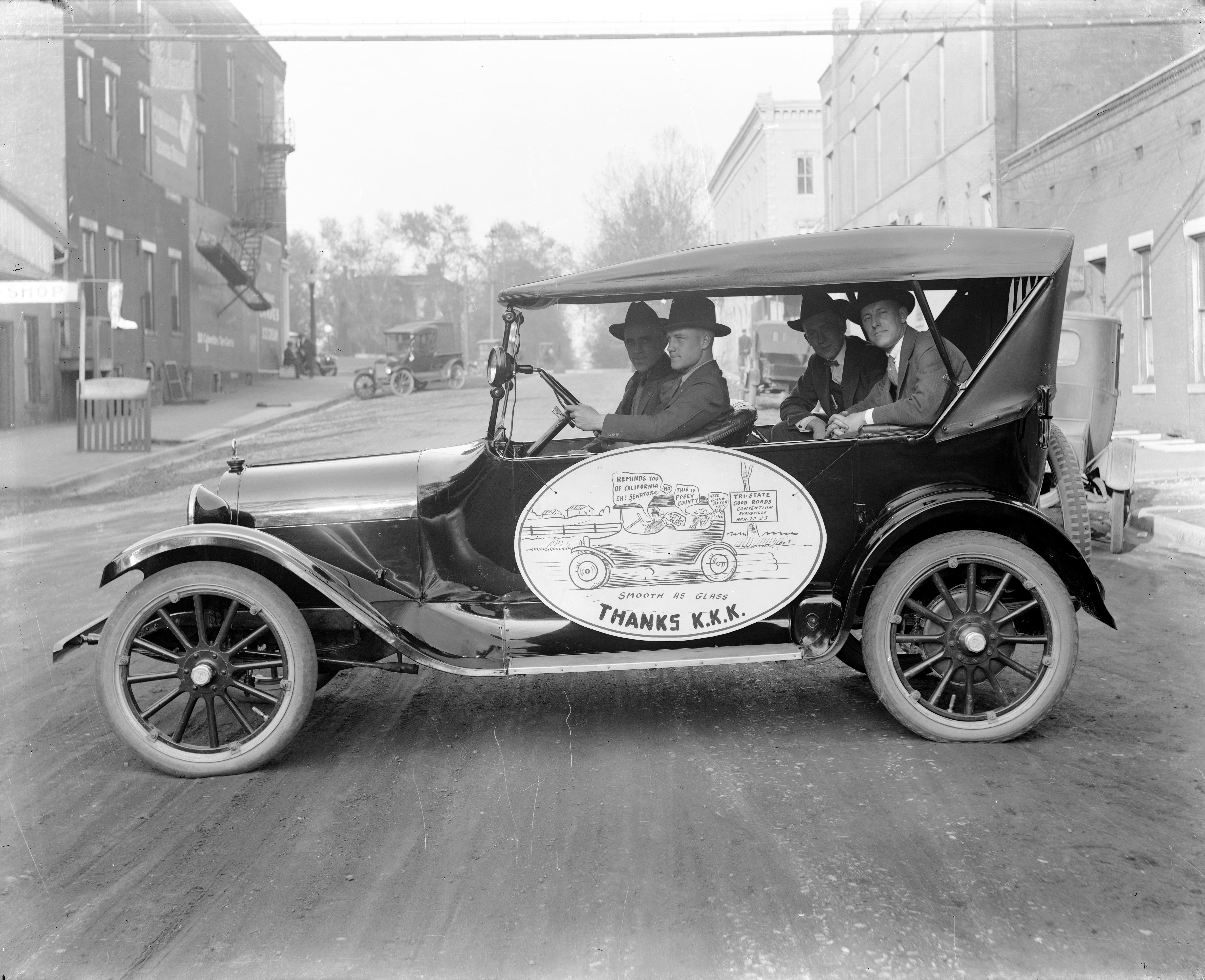 Four unidentified men in a car with Karl K. Knecht cartoon on side, the cartoon announced the Tri-State Good Roads Convention in Evansville April 22-23, year unknown, although the car appears to be from the 1910s. The location is W. 3rd St. In the background on the left is the old Court Hotel which was replaced by a Post Office in 1932.