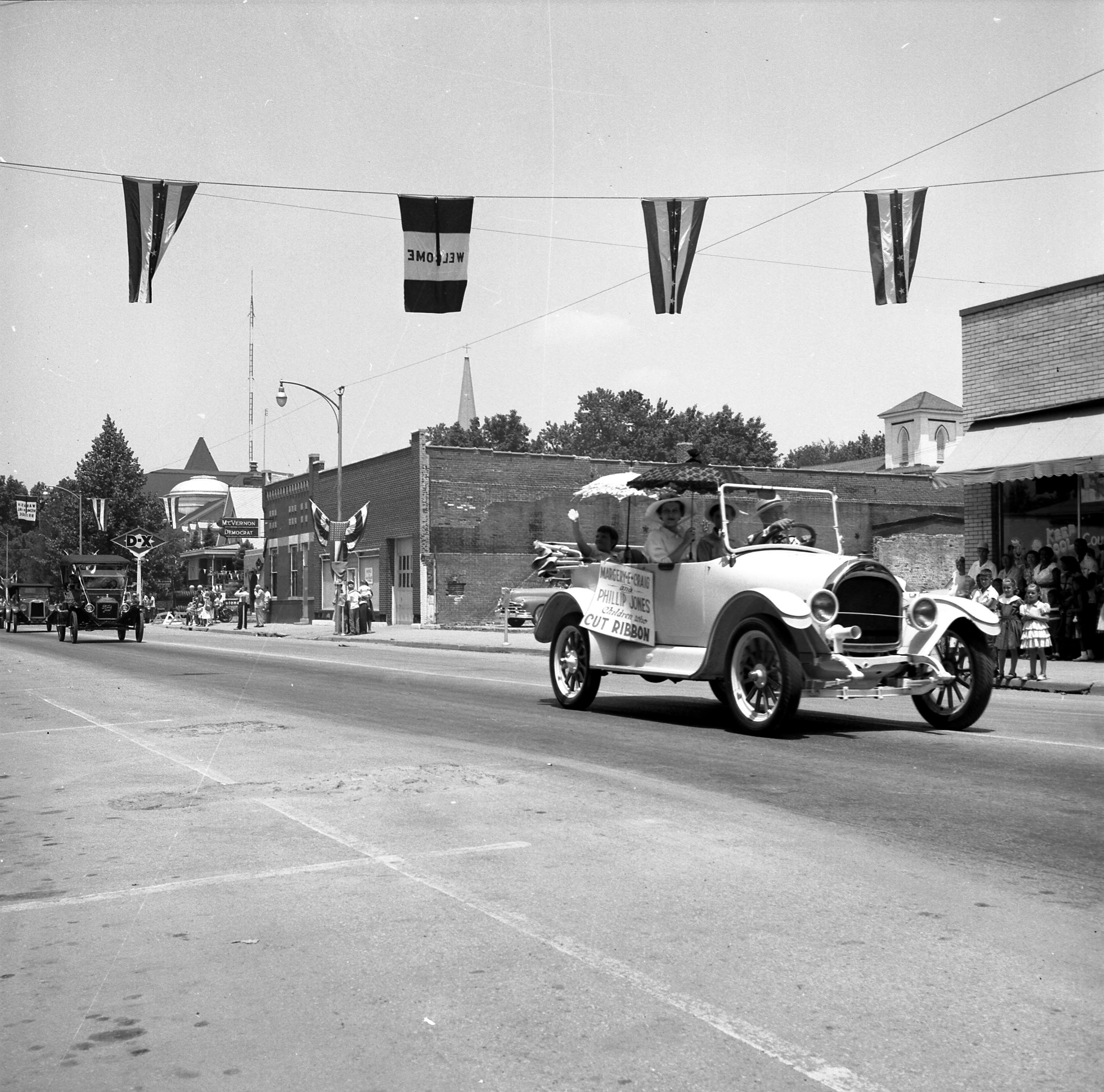 Wabash Memorial Bridge dedication parade. Car carrying children who cut the parade ribbon on Main St. during a parade, in front of the Kroger store.