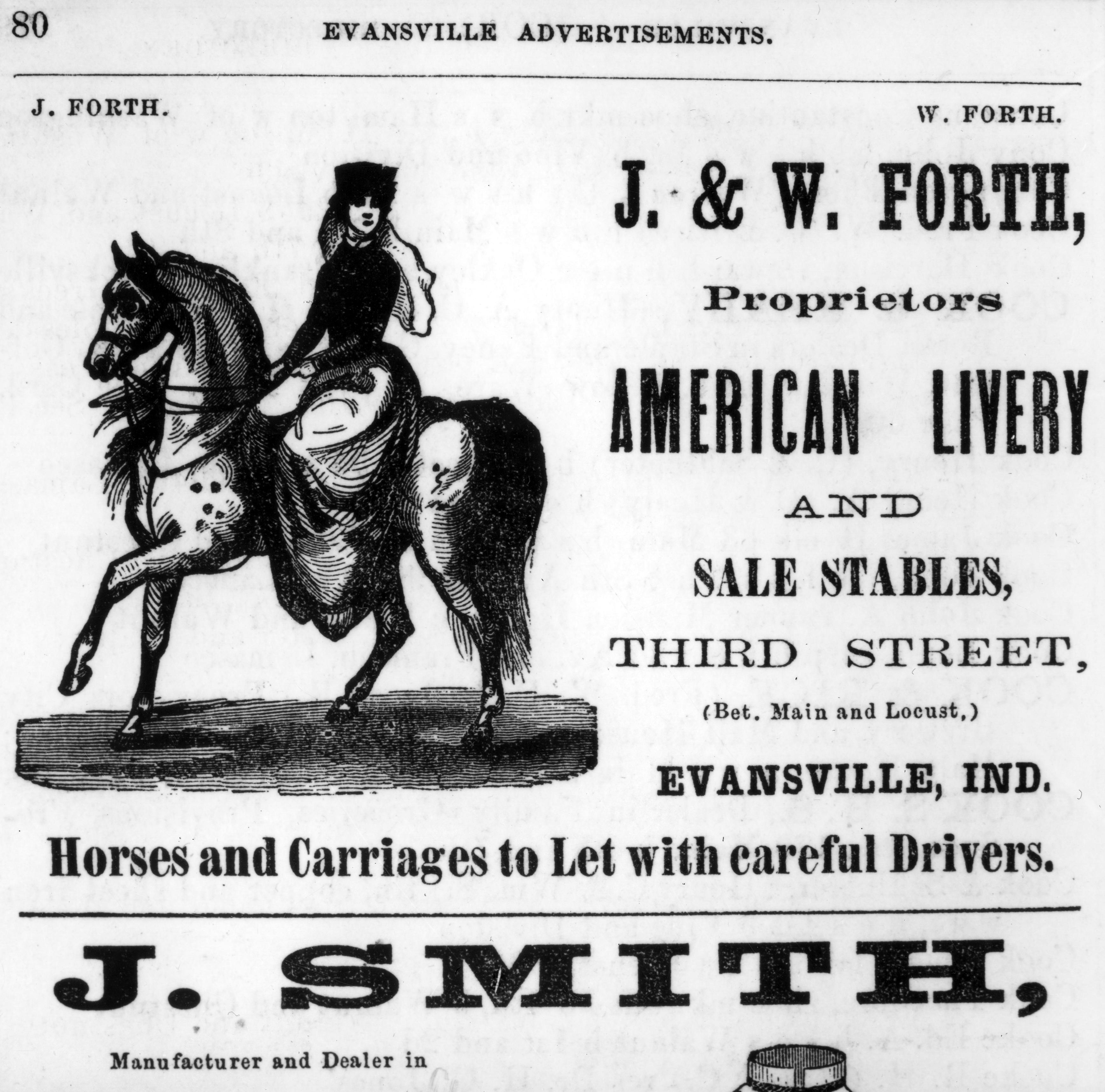 Advertisement for J. and W. Forth Livery and Stables in Evansville, Indiana