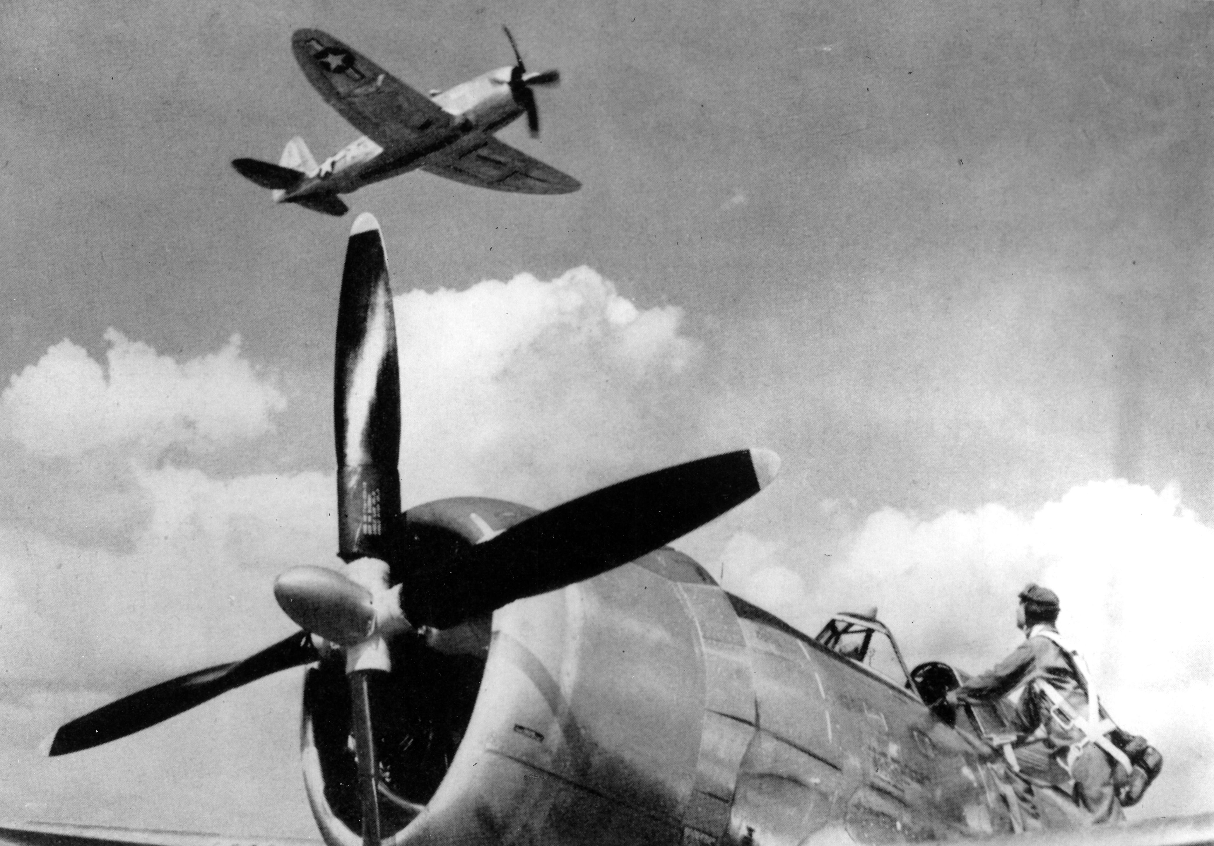Republic Aviation P-47 Thunderbolt planes, one aloft, and the other on the ground with the pilot ready to climb into the cockpit. Built on U.S. Hwy 41 North in 1942, Republic Aviation manufactured almost half of all P-47 Thunderbolts for WWII. It was only in existence until 1945 (in Evansville).