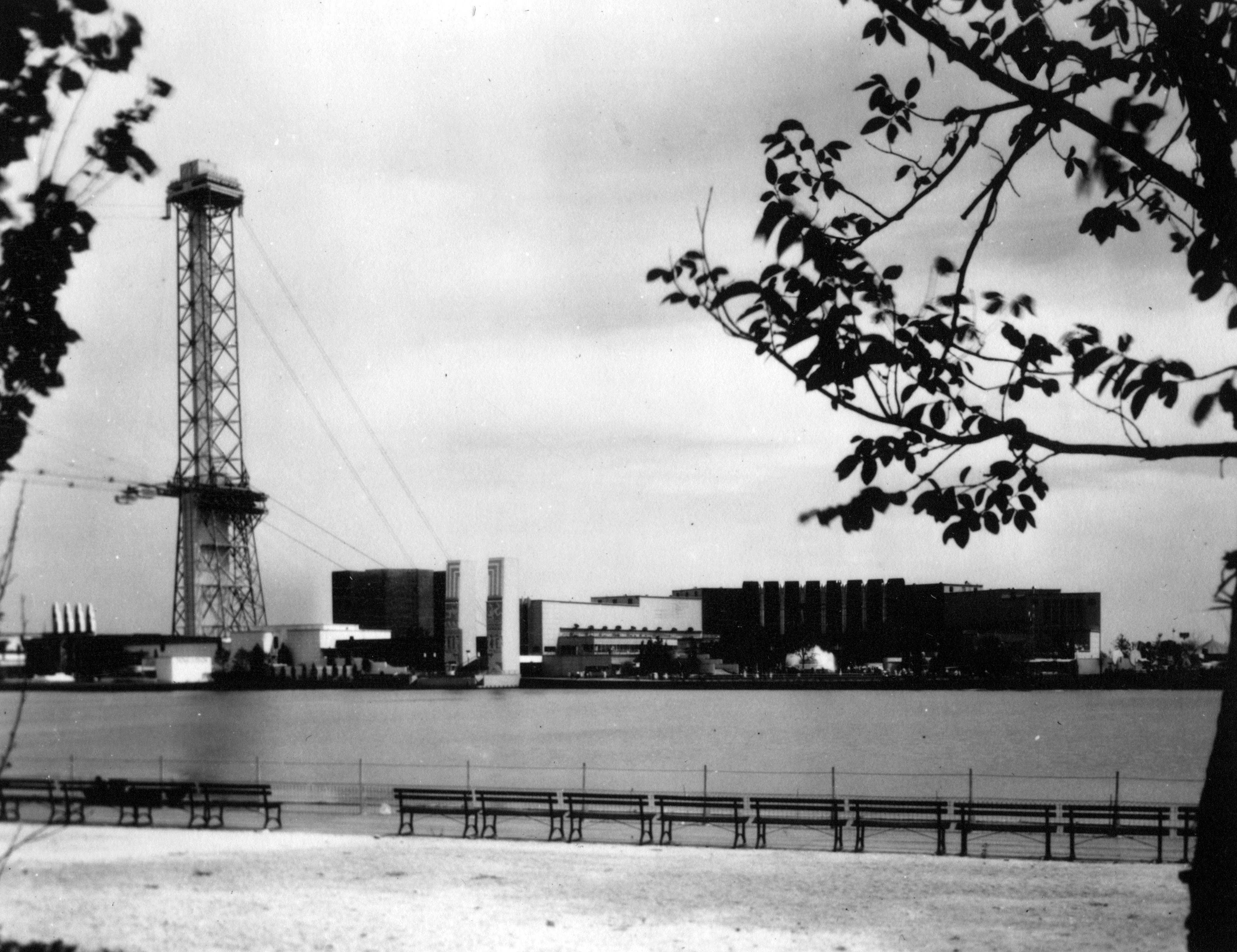 ""The official title of the 1933 World's Fair in Chicago was A Century of Progress International Exposition. The Fair was organized to mark Chicago's one hundred year anniversary. The mission of the Fair was to demonstrate the significance of scientific and technological discoveries to industry and modern society and how those discoveries were being made. The Fair also showcased modern advancements in art, literature, and architecture from across the globe. Exhibits from all over the world included new automobile designs, houses of the future, and babies living in incubators. There was also an abundance of international carnival entertainment at the Fair, including the Skyride, a cable-suspended people mover higher than any building in Chicago. The midway provided games, a roller coaster, shows, and food. "" (encyclopedia.com) This is the East Tower of the Sky Ride, with the matching pillars below part of the Electrical Group Meeting. (These two pillars are the Water Gate, with each more than 100 ft. tall. They represent Light and Sound, are vaguely Aztec, and were done by sculptor Lee Lawrie.) The Sky Ride towers were nicknamed Amos and Andy, rose to 628 ft., and spanned 1850 feet across the lagoon.