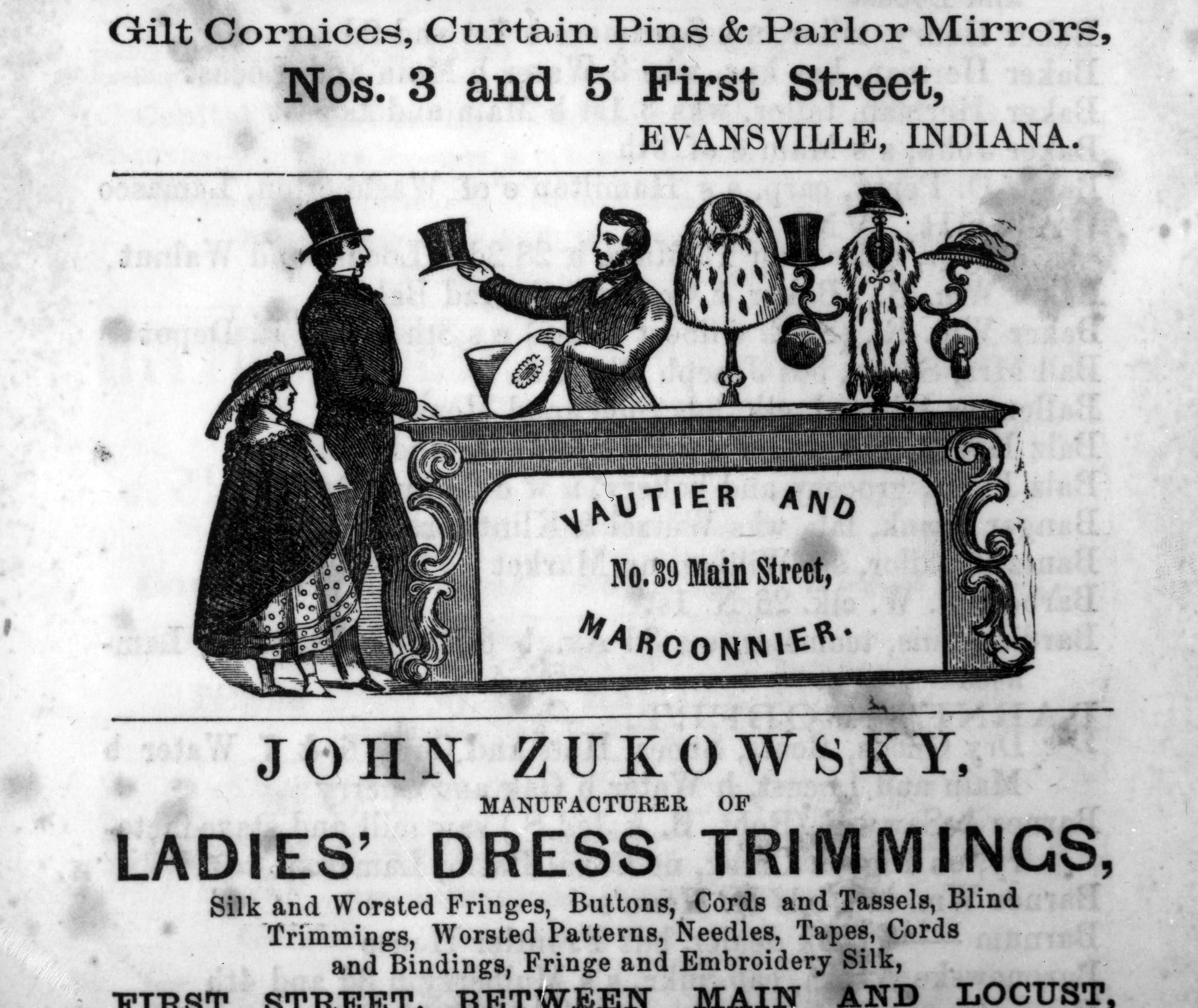 Three advertisements: first for a business selling cornices and mirrors and located at Nos. 3 and 5 First St., then Vautier and Marconnier at 39 Main St., and John Zukowsky, manufacturier of ladies' dress trimmings, on First St. between Main St. and Locust St.