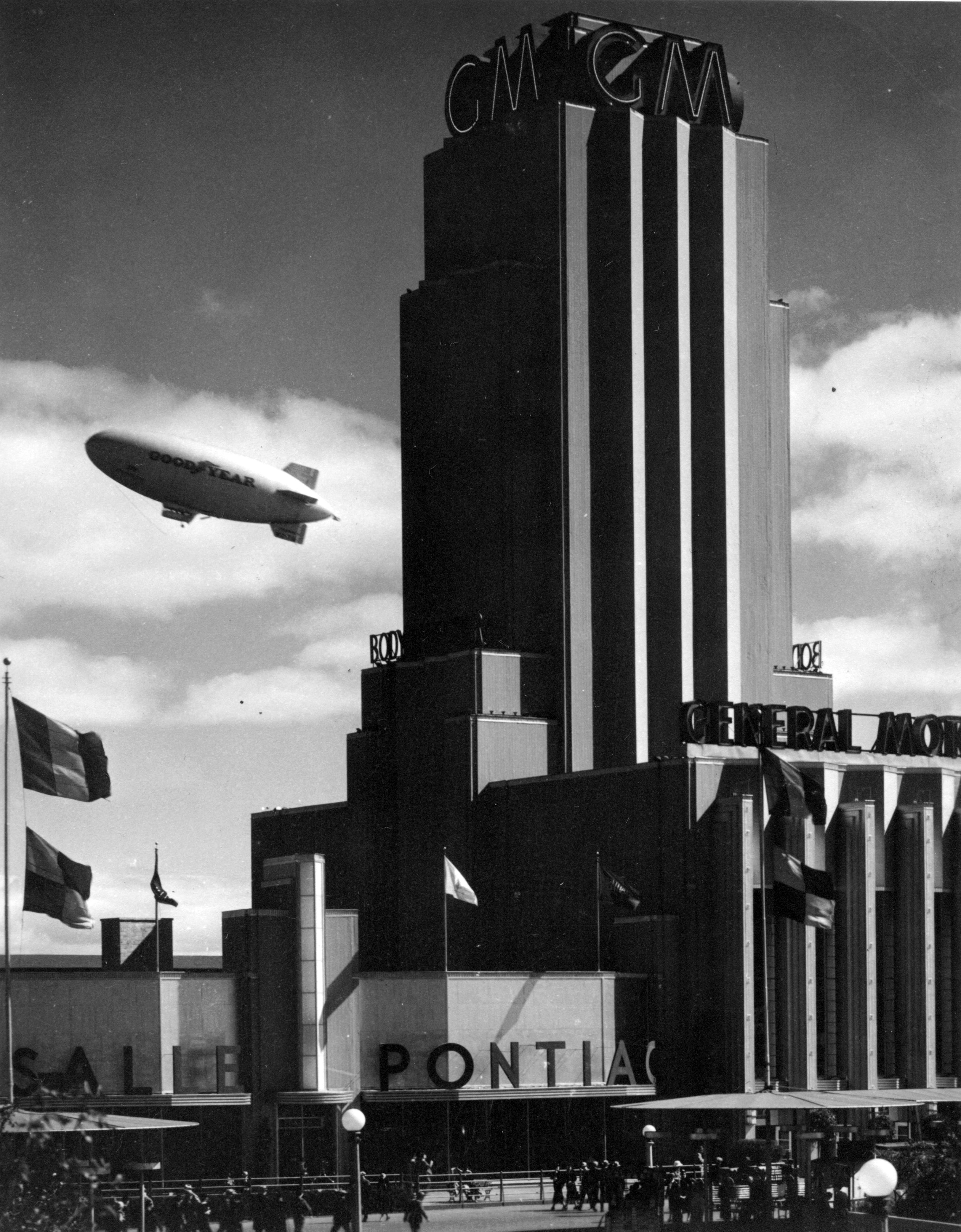 ""The official title of the 1933 World's Fair in Chicago was A Century of Progress International Exposition. The Fair was organized to mark Chicago's one hundred year anniversary. The mission of the Fair was to demonstrate the significance of scientific and technological discoveries to industry and modern society and how those discoveries were being made. The Fair also showcased modern advancements in art, literature, and architecture from across the globe. Exhibits from all over the world included new automobile designs, houses of the future, and babies living in incubators. There was also an abundance of international carnival entertainment at the Fair, including the Skyride, a cable-suspended people mover higher than any building in Chicago. The midway provided games, a roller coaster, shows, and food. "" (encyclopedia.com) This is the General Motors Building, with the Goodyear blimp flying by. ""The part that automotive engineering has played in our civilization is graphically represented in the General Motors building. It stands on rising ground at the foot of Thirty-first street in the midst of a lovely, formal garden surrounded by willows and with Lake Michigan as its background. The building is an eighth of a mile long and 306 feet wide, surmounted by a 177-foot tower, brilliantly colored, and illuminated. It was designed by Albert Kahn. The entrance hall divides two main display rooms, each containing 18,000 square feet."" (https://chicagology.com/centuryprogress/1933fair02/)