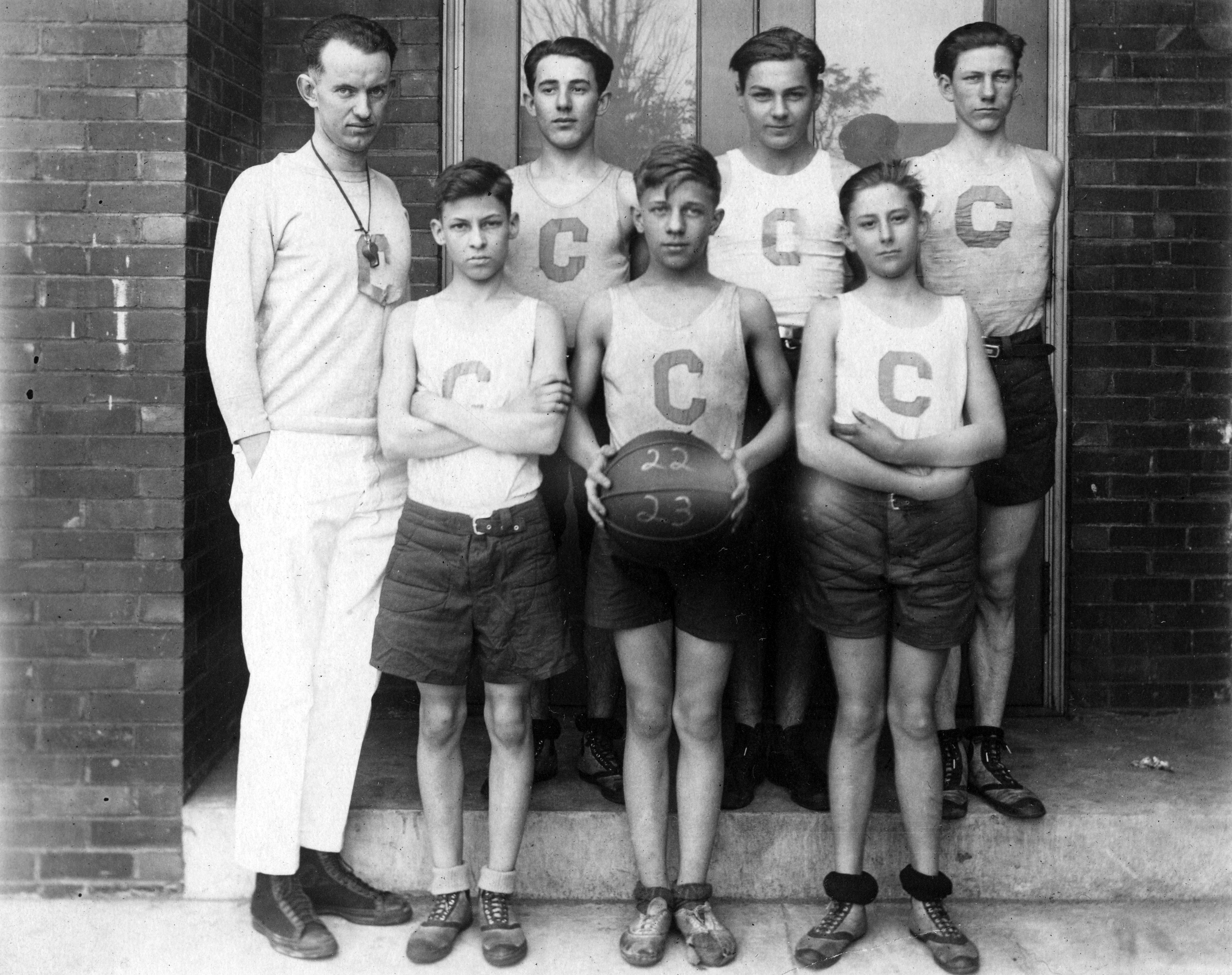 Columbia School's basketball team (6 players, 1 coach). This coach appears to be the man identified as Aner Adye in earlier photographs. Adye (1900-1974) was a teacher at Columbia Elementary and Central High School, where he also served as the golf coach. Columbia School, at 601 W. Columbia St., was built in 1874-1875, added on to twice in the next 50 years, closed in 1978 and was razed in 1979. The numbers on the basketball, 22 and 23, probably refer to the 1922-1923 school year.