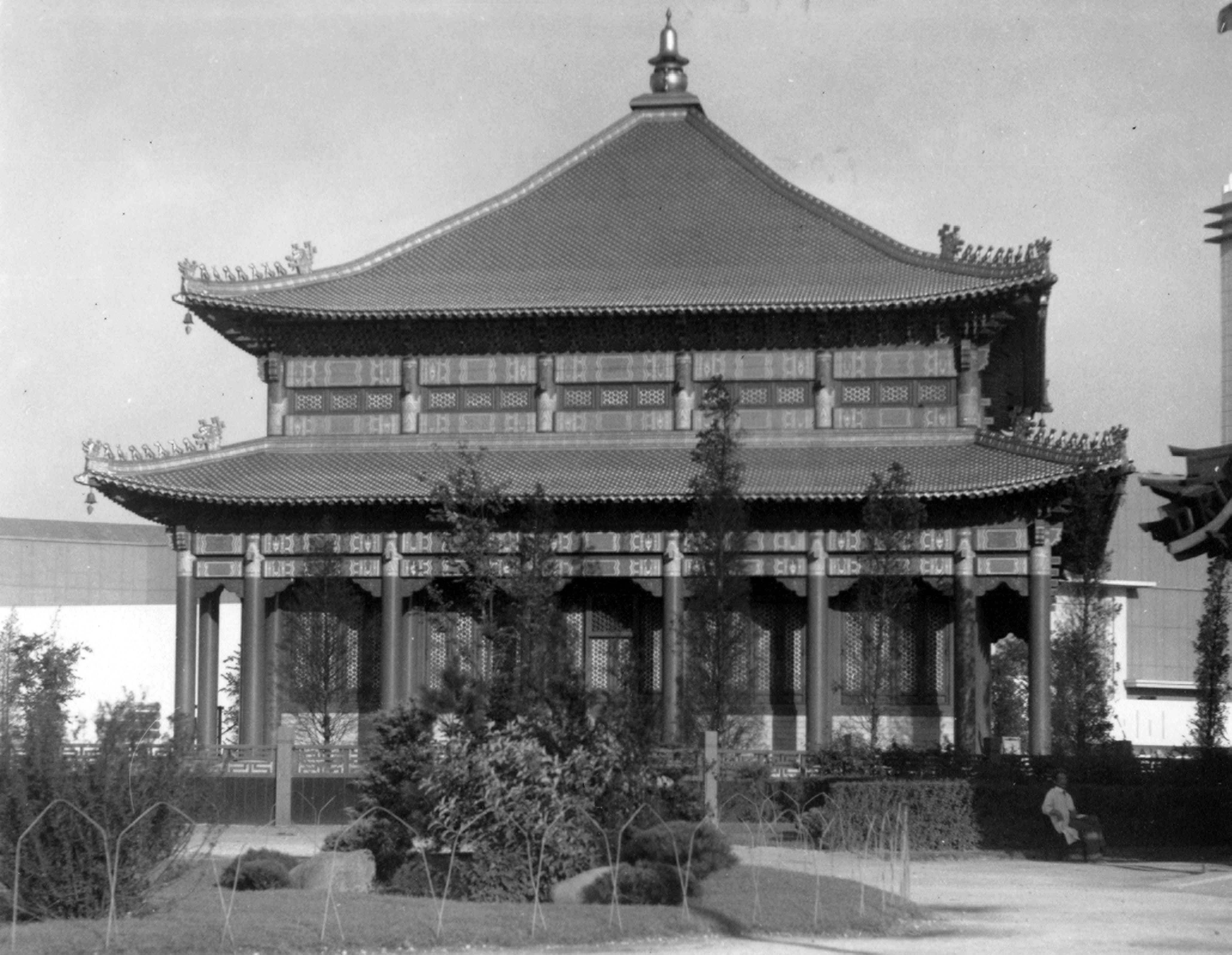 ""The official title of the 1933 World's Fair in Chicago was A Century of Progress International Exposition. The Fair was organized to mark Chicago's one hundred year anniversary. The mission of the Fair was to demonstrate the significance of scientific and technological discoveries to industry and modern society and how those discoveries were being made. The Fair also showcased modern advancements in art, literature, and architecture from across the globe. Exhibits from all over the world included new automobile designs, houses of the future, and babies living in incubators. There was also an abundance of international carnival entertainment at the Fair, including the Skyride, a cable-suspended people mover higher than any building in Chicago. The midway provided games, a roller coaster, shows, and food. "" (encyclopedia.com) This pagoda was part of the Japanese exhibition.