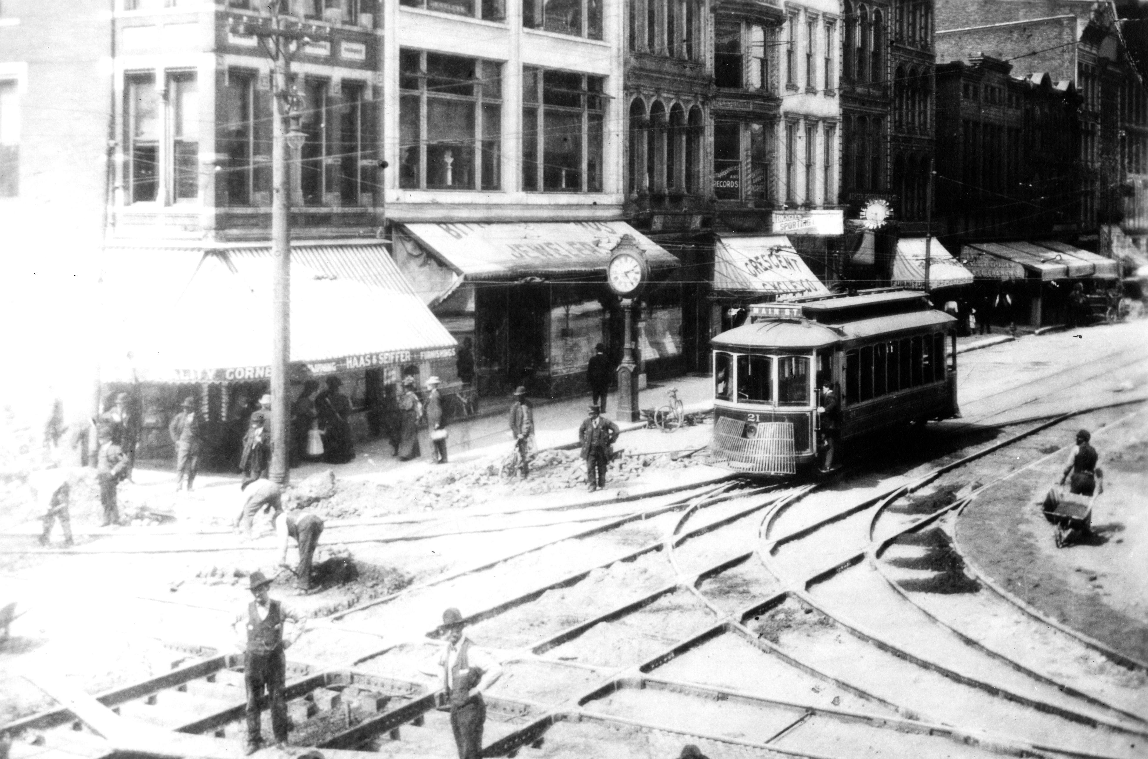 Streetcar track improvement at 2nd St. and Main St. Car #21 is in center of photograph. Identifiable businesses are, from left: corner business not identified, Bitterman Bros. Jewelers at 202-204 Main St., Crescent Cycle Co. at 208 Main St.