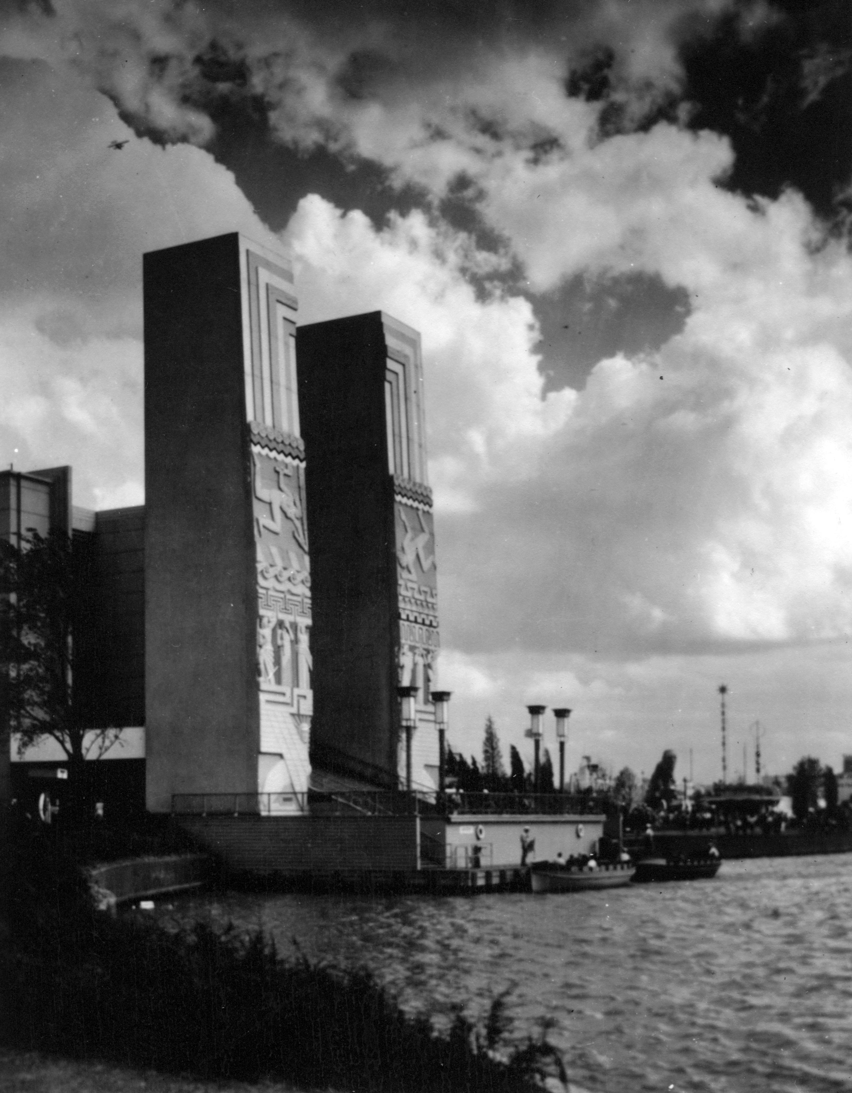 ""The official title of the 1933 World's Fair in Chicago was A Century of Progress International Exposition. The Fair was organized to mark Chicago's one hundred year anniversary. The mission of the Fair was to demonstrate the significance of scientific and technological discoveries to industry and modern society and how those discoveries were being made. The Fair also showcased modern advancements in art, literature, and architecture from across the globe. Exhibits from all over the world included new automobile designs, houses of the future, and babies living in incubators. There was also an abundance of international carnival entertainment at the Fair, including the Skyride, a cable-suspended people mover higher than any building in Chicago. The midway provided games, a roller coaster, shows, and food. "" (encyclopedia.com) These towers are part of the Electrical Group Exhibition. They are the Water Gate, with each tower more than 100 ft. tall. They represent Light and Sound, are vaguely Aztec, and were done by sculptor Lee Lawrie.