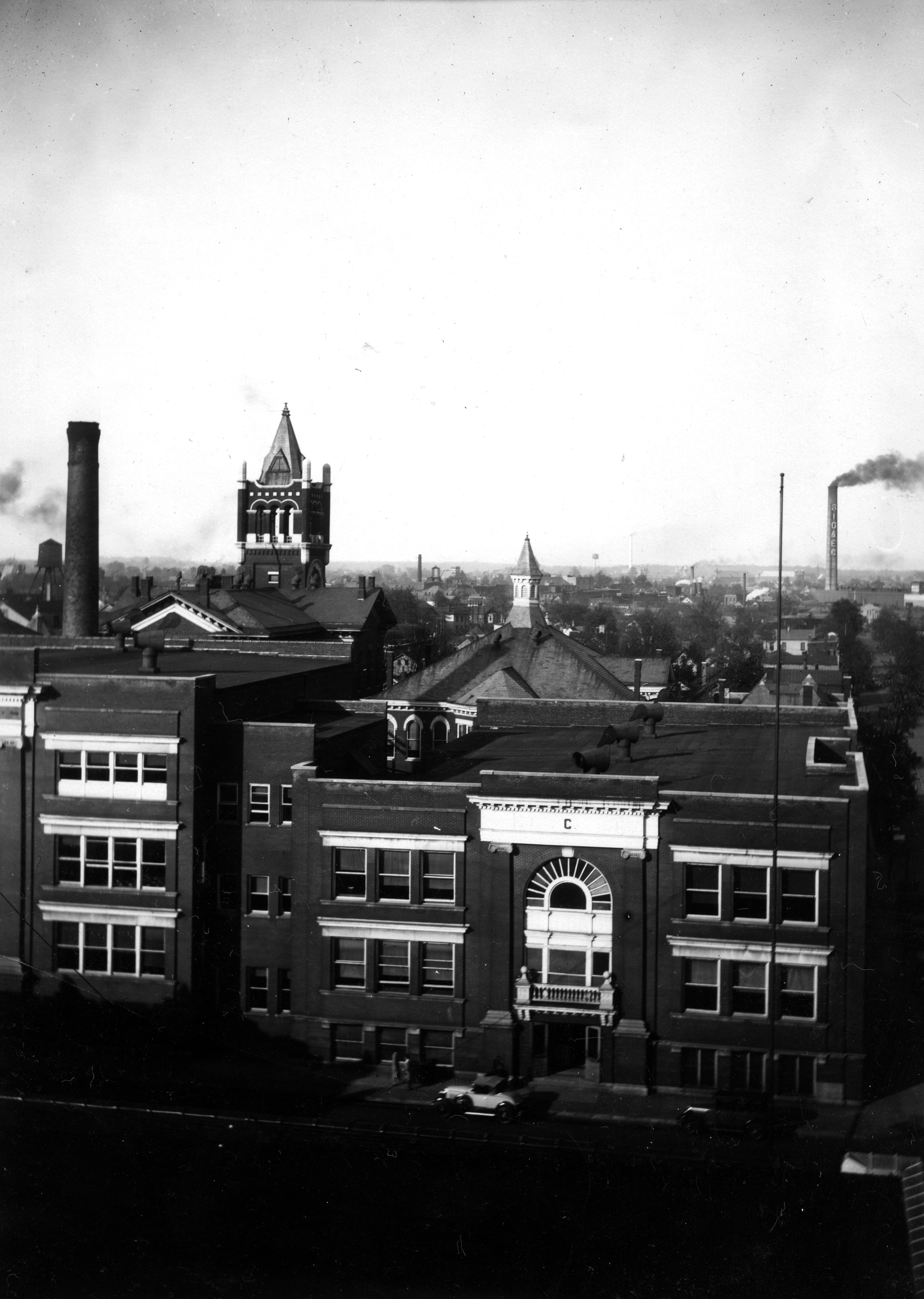 Elevated view of Central High School at 203 NW 6th St. THis is looking at the back of the school on 6th St. Evansville High School was the first high school in town and moved into its permanent location at 203 NW 6th St. in 1868. When another high school was established in 1918, EHS was renamed Central High School. Central High School still exists, although it is in a different location and the NW 6th St. facility was razed in 1973.