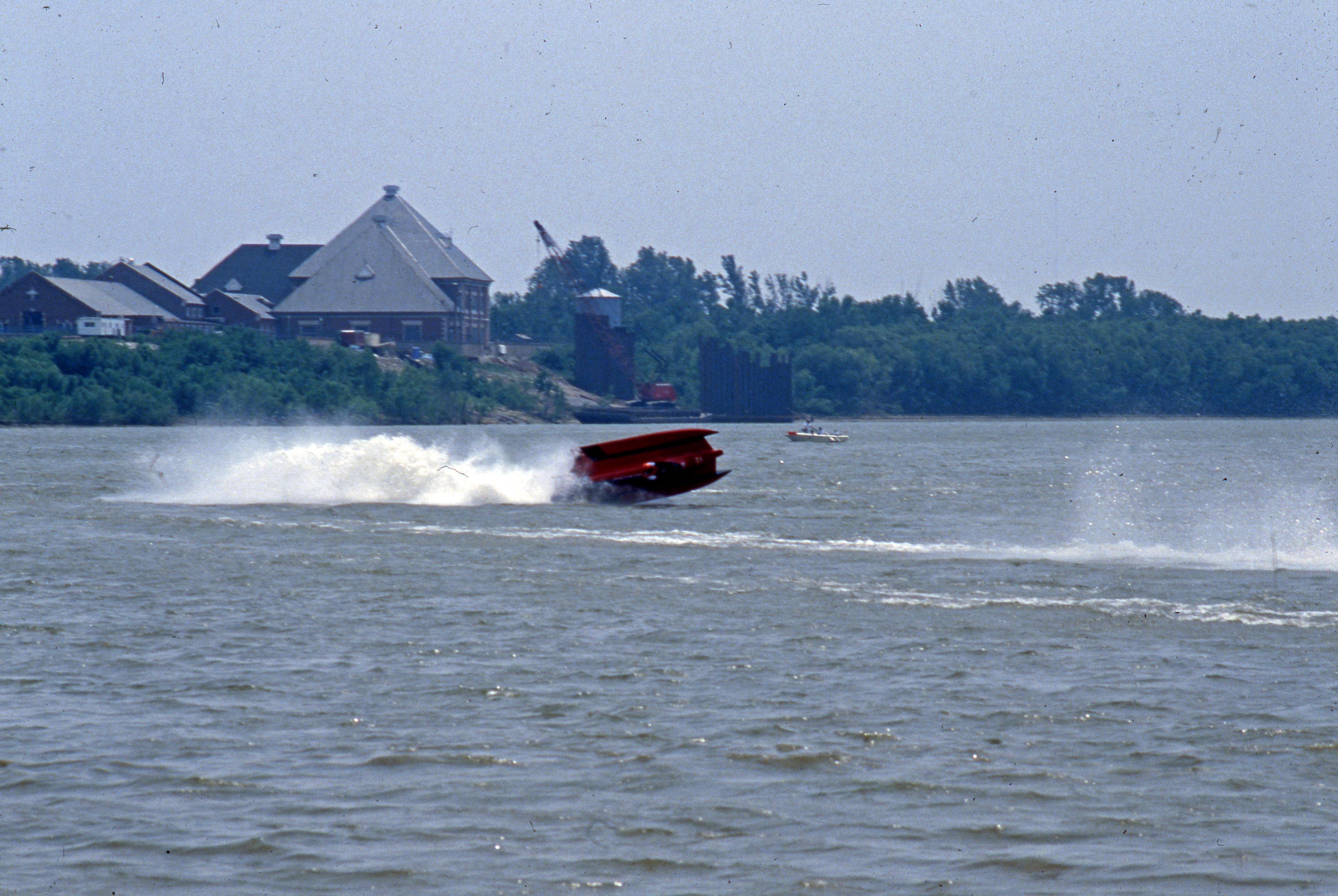 A hydroplane tipped on its side, about to crash, on the Ohio River, with the Evansville Water and Sewer Utility in the background. From 1979-2009 Evansville hosted Thunder on the Ohio, a race in the Unlimited Hydroplane circuit. In recent years the event or a similar one has been revived.