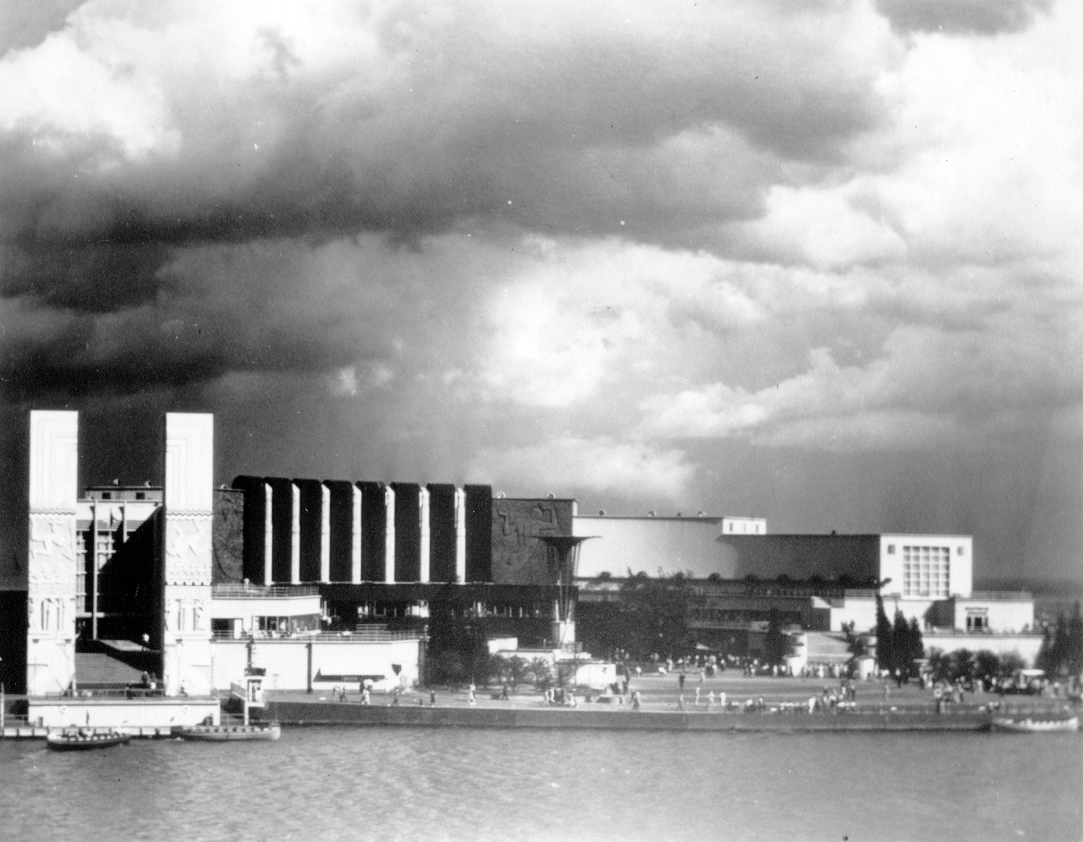 The official title of the 1933 World's Fair in Chicago was A Century of Progress International Exposition. The Fair was organized to mark Chicago's one hundred year anniversary. The mission of the Fair was to demonstrate the significance of scientific and technological discoveries to industry and modern society and how those discoveries were being made. The Fair also showcased modern advancements in art, literature, and architecture from across the globe. Exhibits from all over the world included new automobile designs, houses of the future, and babies living in incubators. There was also an abundance of international carnival entertainment at the Fair, including the Skyride, a cable-suspended people mover higher than any building in Chicago. The midway provided games, a roller coaster, shows, and food. (encyclopedia.com) These are the Electrical Court buildings facing Lake Michigan. The engraved image in the middle (figure with hands above his head) ""represents Atomic Energy, bearing the inscription, Energy is the substance of all things the cycles of the atoms, the play of the elements are in forms cast as by a mighty hand to become the world�s foundations. (https://chicagology.com/centuryprogress/1933fair12/) The sculptor was Ulric H. Ellerhusen. The two towers are the Water Gate, each tower is more than 100 ft. tall. They represent Light and Sound, are vaguely Aztec, and were done by sculptor Lee Lawrie.