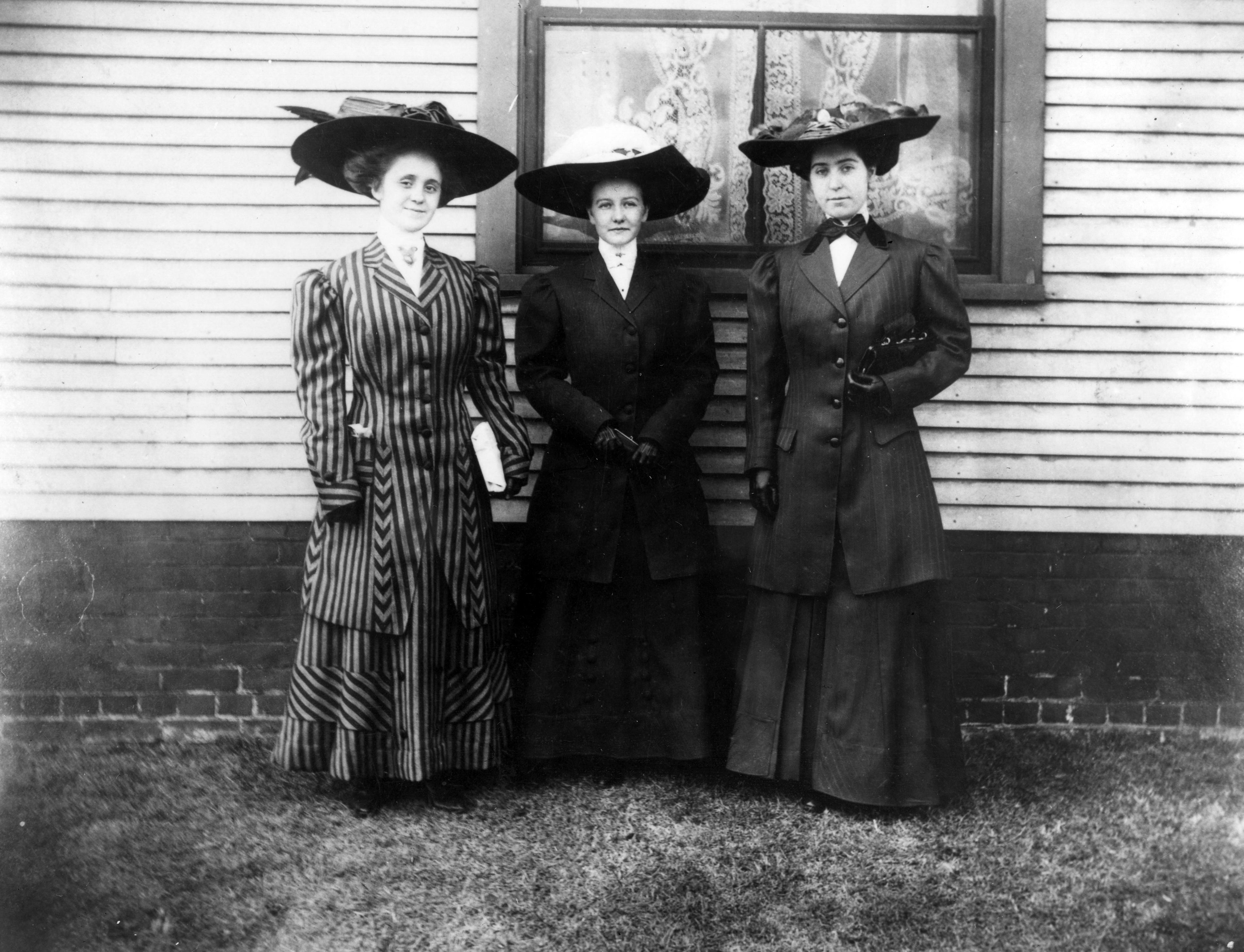 Three unidentified women, stylishly dressed, posing outside a house with lace curtains at the window