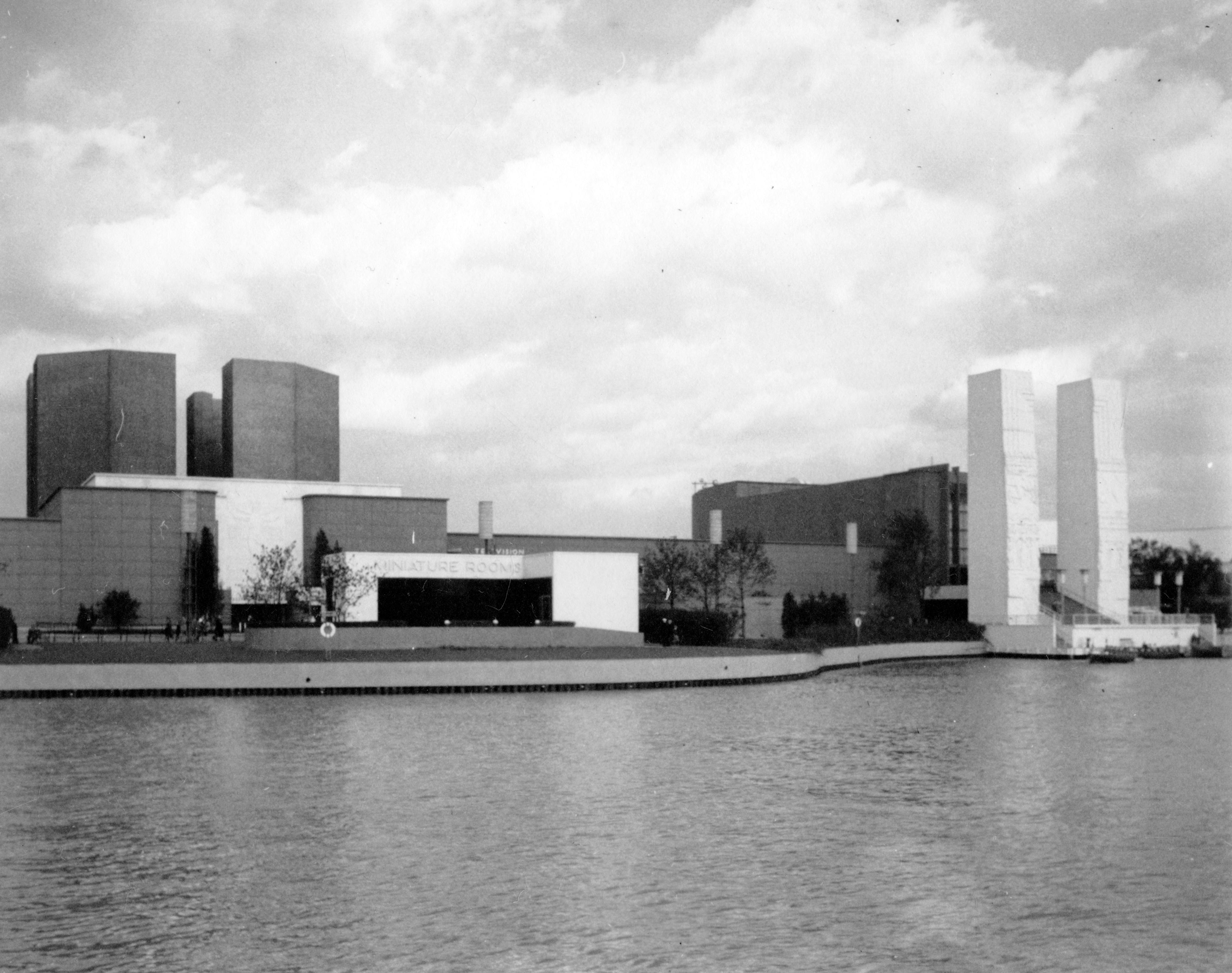 ""The official title of the 1933 World's Fair in Chicago was A Century of Progress International Exposition. The Fair was organized to mark Chicago's one hundred year anniversary. The mission of the Fair was to demonstrate the significance of scientific and technological discoveries to industry and modern society and how those discoveries were being made. The Fair also showcased modern advancements in art, literature, and architecture from across the globe. Exhibits from all over the world included new automobile designs, houses of the future, and babies living in incubators. There was also an abundance of international carnival entertainment at the Fair, including the Skyride, a cable-suspended people mover higher than any building in Chicago. The midway provided games, a roller coaster, shows, and food. "" (encyclopedia.com) Looking across the water, here is the Miniature Rooms Exhibit. To the right are the two towers of the Water Gate, with each tower more than 100 ft. tall. They represent Light and Sound, are vaguely Aztec, and were done by sculptor Lee Lawrie.