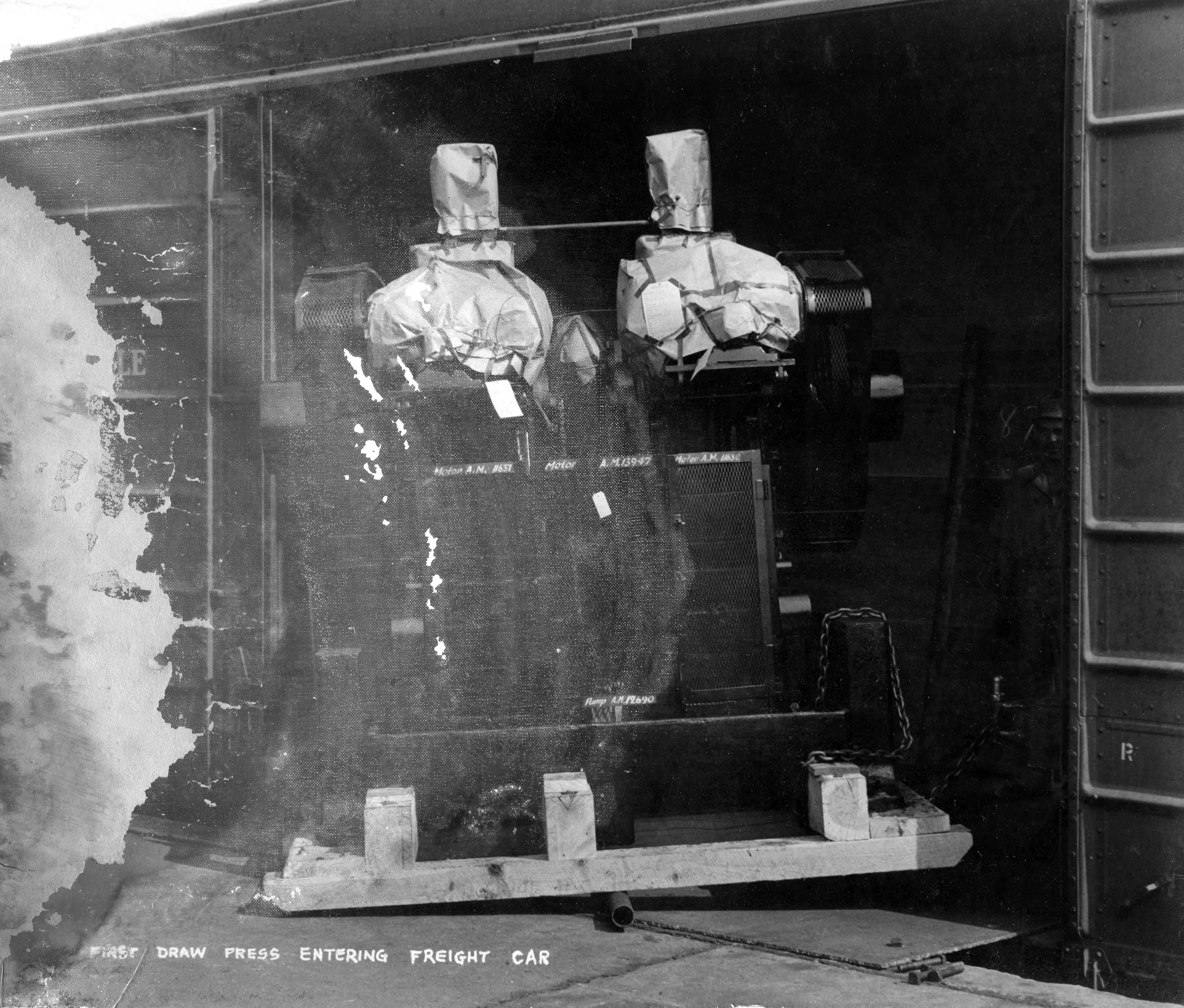 First draw press entering freight car at the Evansville Ordnance Plant at the Chrysler plant at 1625 N. Garvin St.