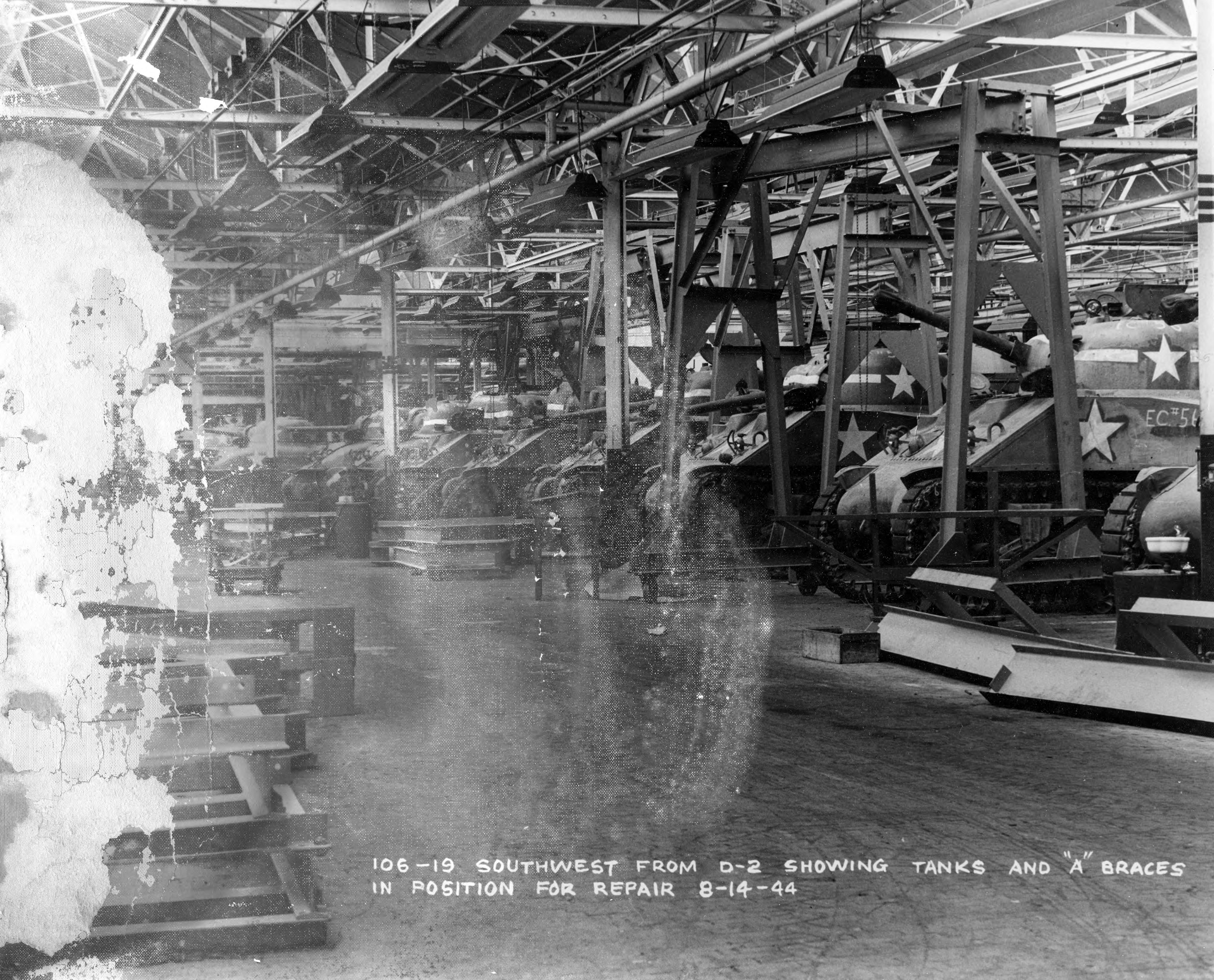 Tanks and A braces ready for repair at the Evansville Ordnance Plant at the Chrysler plant in Evansville, Indiana