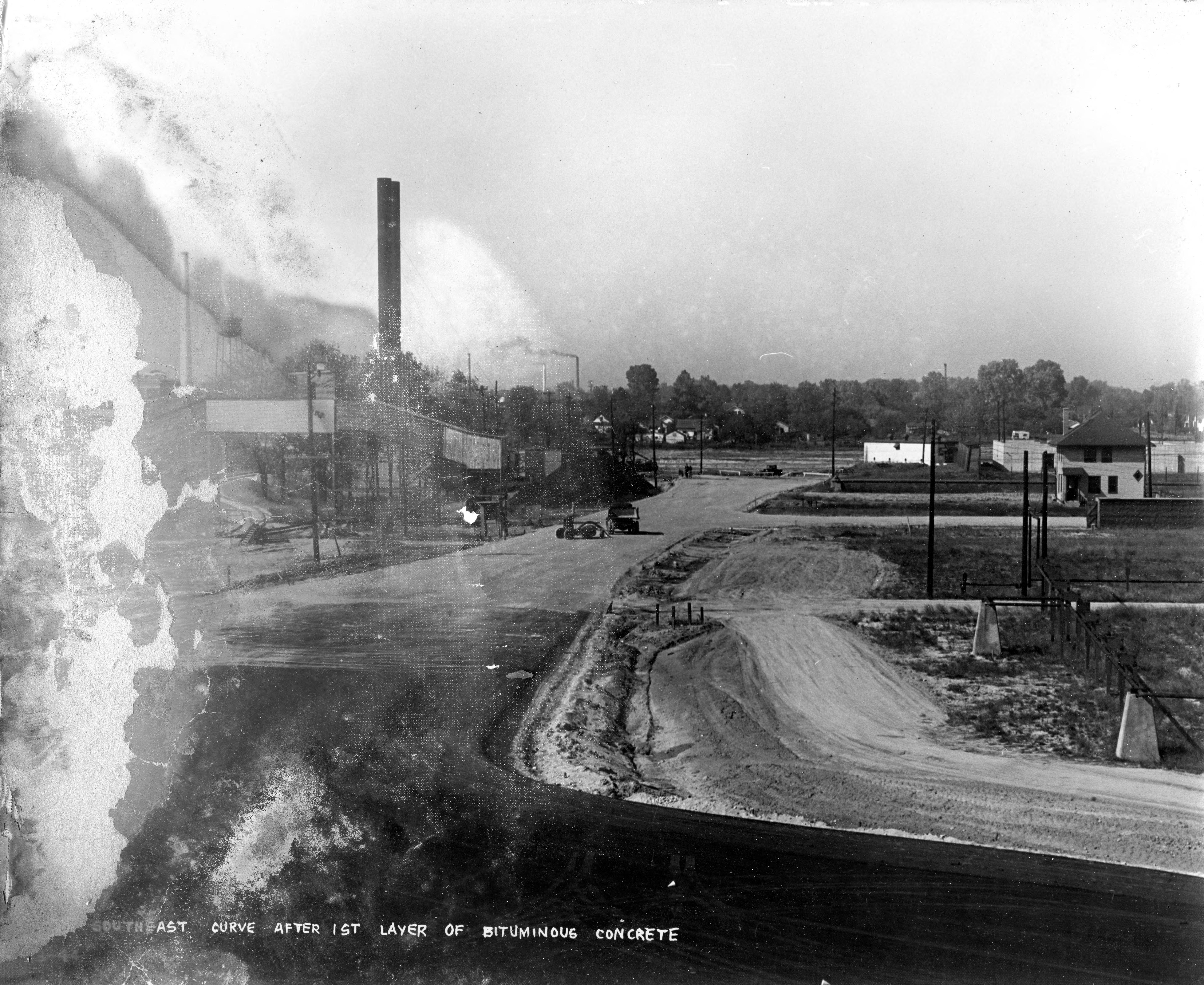 Southeast curve from tower 7, after laying first layer of bituminous concrete at the testing track at the Evansville Ordnance Plant at the Chrysler plant at 1625 N. Garvin St.