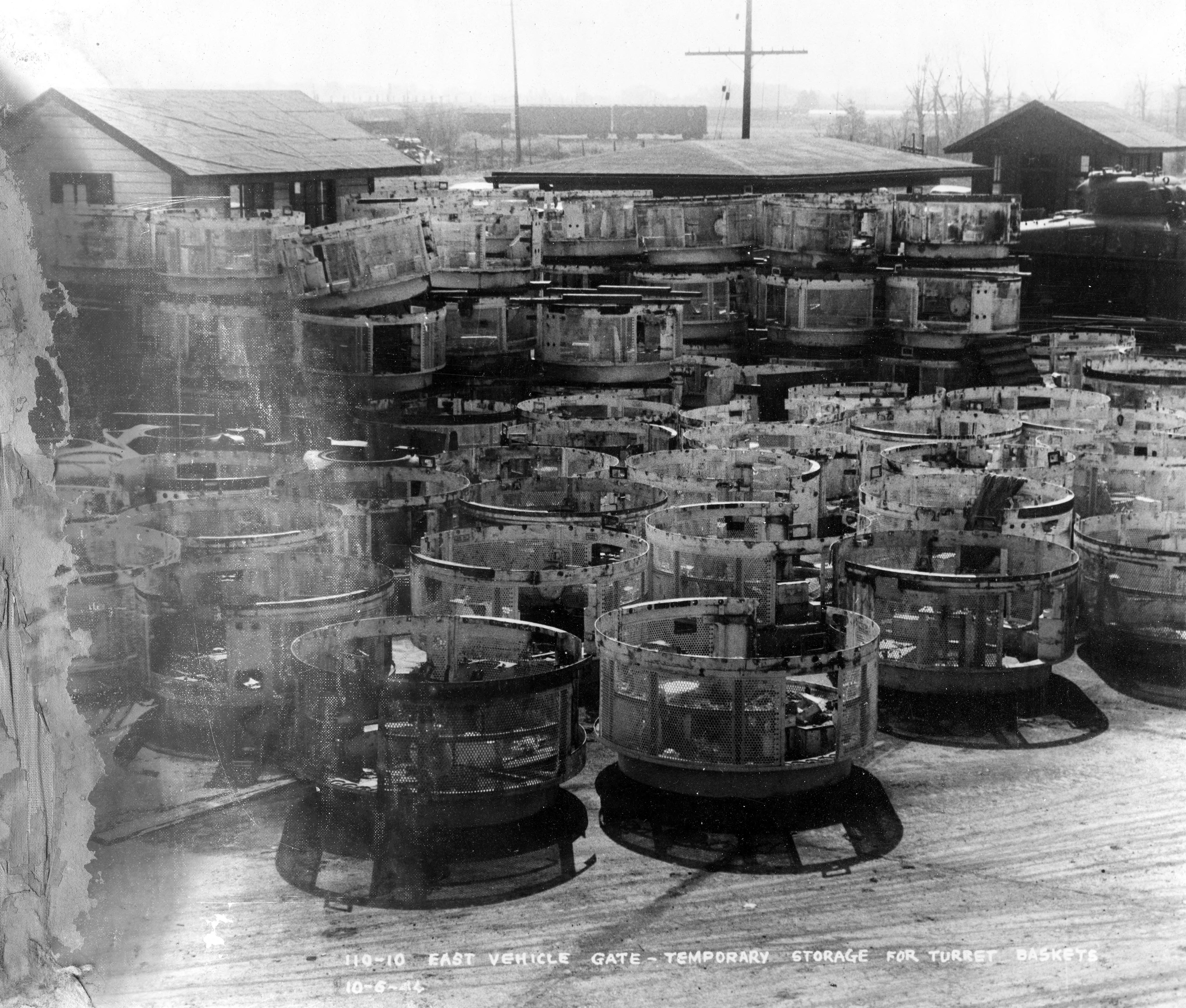 East vehicle gate, temporary storage for turret baskets. at the Evansville Ordnance Plant at the Chrysler plant at 1625 N. Garvin St.