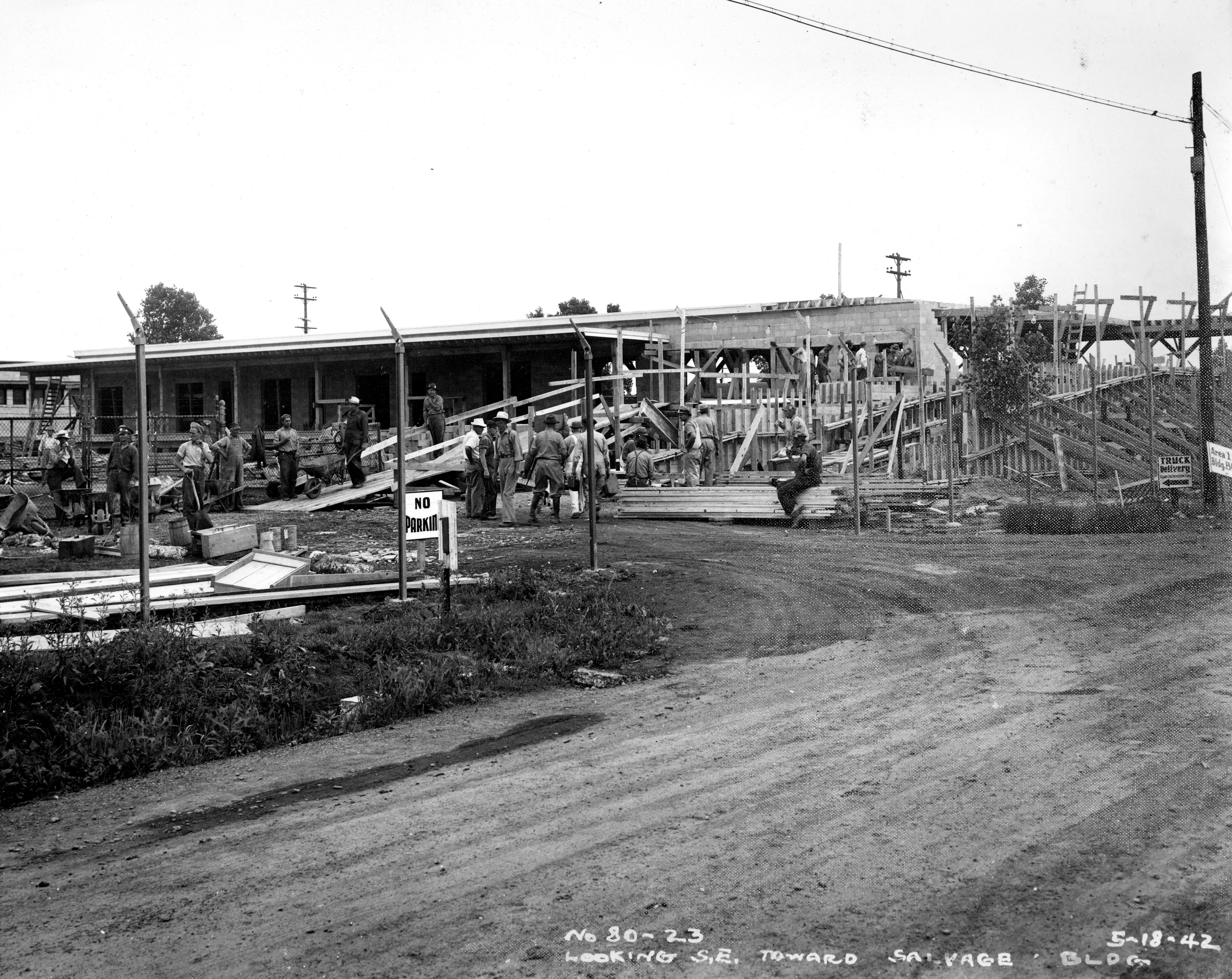 Looking southeast toward men working on the construction of the salvage building at the Evansville Ordnance Plant at the Chrysler plant at 1625 N. Garvin St.