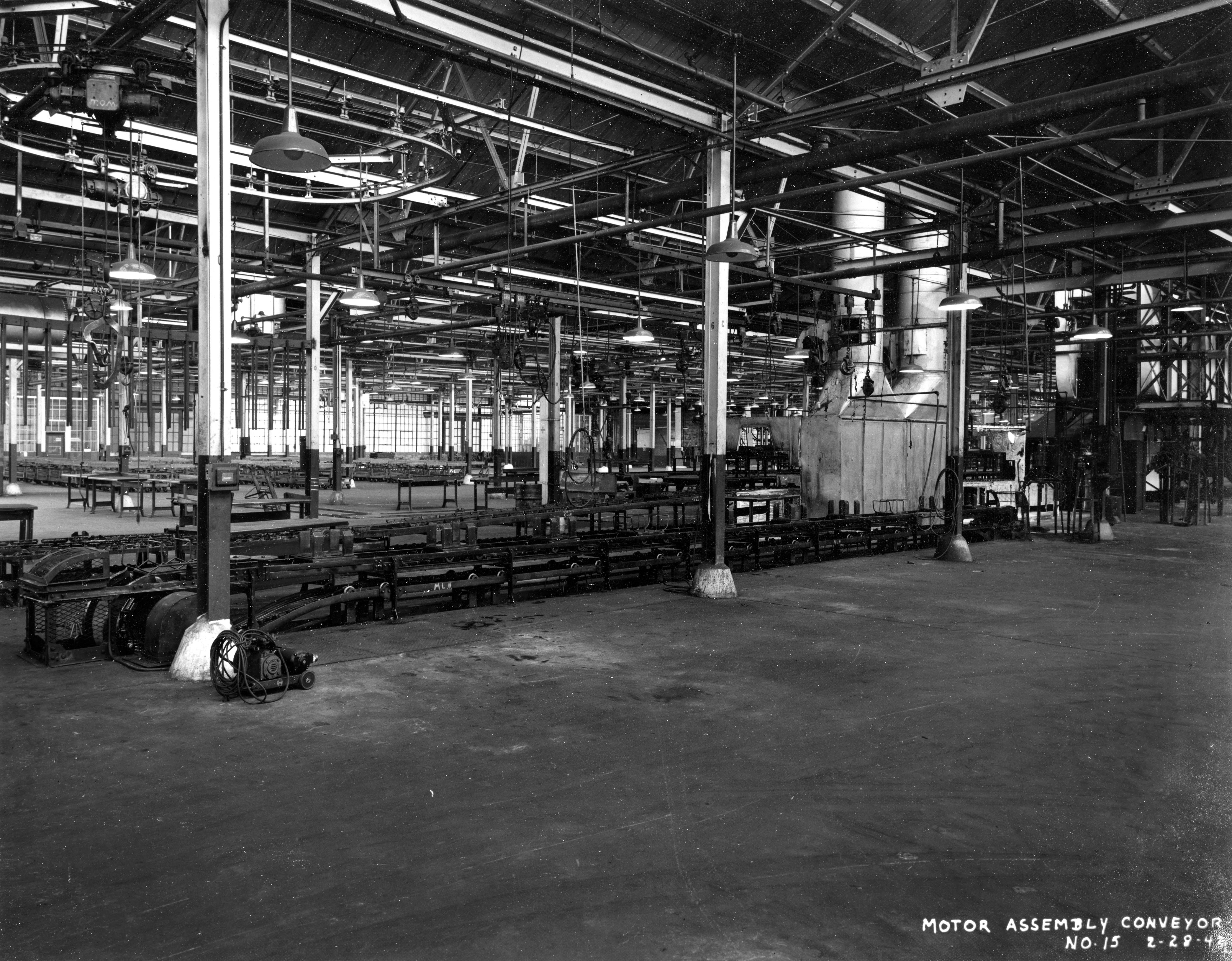 Motor assembly conveyor at the Evansville Ordnance Plant at the Chrysler plant in Evansville, Indiana