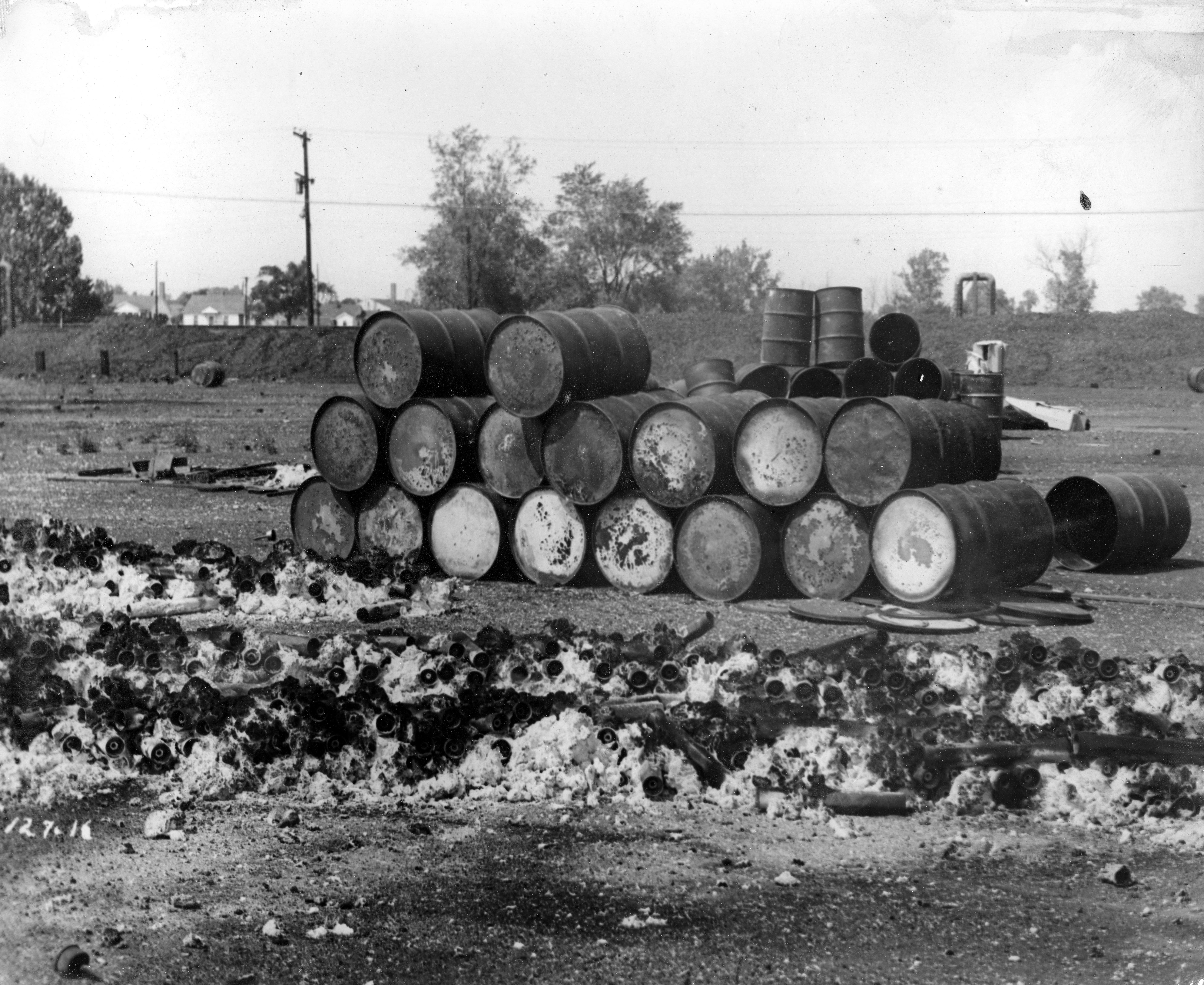 View of burning yard showing the demolition of M-74 bombs at the Evansville Ordnance Plant at the Chrysler plant at 1625 N. Garvin St.